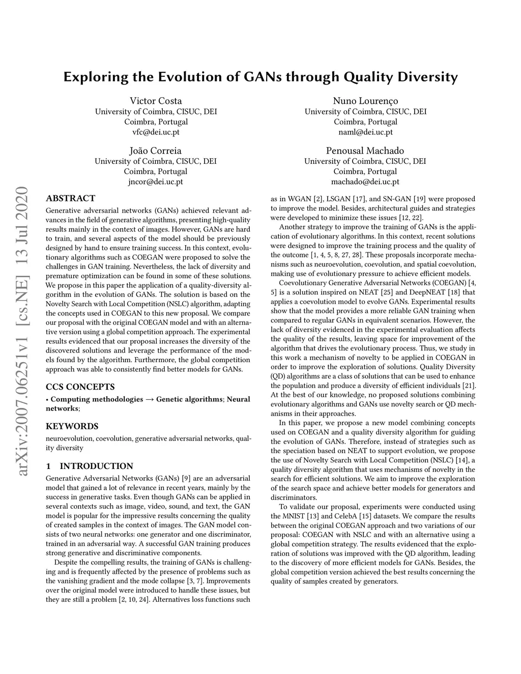 Generative adversarial networks (GANs) achieved relevant advances in the field of generative algorithms, presenting high-quality results mainly in the context of images. However, GANs are hard to train, and several aspects of the model should be previously designed by hand to ensure training success. In this context, evolutionary algorithms such as COEGAN were proposed to solve the challenges in GAN training. Nevertheless, the lack of diversity and premature optimization can be found in some of these solutions. We propose in this paper the application of a quality-diversity algorithm in the evolution of GANs. The solution is based on the Novelty Search with Local Competition (NSLC) algorithm, adapting the concepts used in COEGAN to this new proposal. We compare our proposal with the original COEGAN model and with an alternative version using a global competition approach. The experimental results evidenced that our proposal increases the diversity of the discovered solutions and leverage the performance of the models found by the algorithm. Furthermore, the global competition approach was able to consistently find better models for GANs.