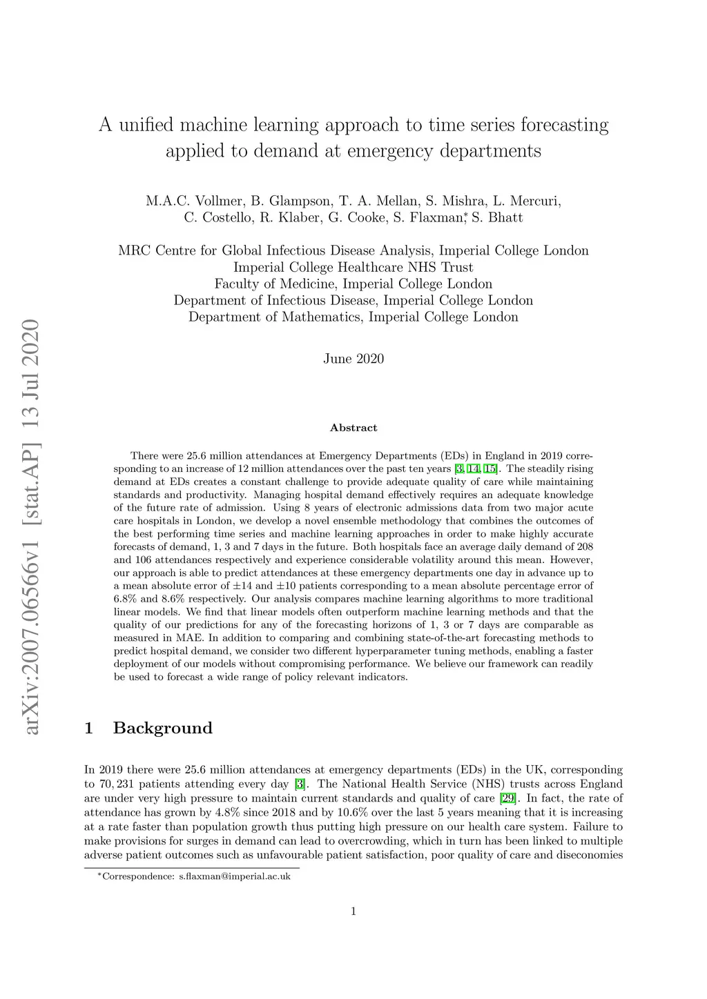 There were 25.6 million attendances at Emergency Departments (EDs) in England in 2019 corresponding to an increase of 12 million attendances over the past ten years. The steadily rising demand at EDs creates a constant challenge to provide adequate quality of care while maintaining standards and productivity. Managing hospital demand effectively requires an adequate knowledge of the future rate of admission. Using 8 years of electronic admissions data from two major acute care hospitals in London, we develop a novel ensemble methodology that combines the outcomes of the best performing time series and machine learning approaches in order to make highly accurate forecasts of demand, 1, 3 and 7 days in the future. Both hospitals face an average daily demand of 208 and 106 attendances respectively and experience considerable volatility around this mean. However, our approach is able to predict attendances at these emergency departments one day in advance up to a mean absolute error of +/- 14 and +/- 10 patients corresponding to a mean absolute percentage error of 6.8% and 8.6% respectively. Our analysis compares machine learning algorithms to more traditional linear models. We find that linear models often outperform machine learning methods and that the quality of our predictions for any of the forecasting horizons of 1, 3 or 7 days are comparable as measured in MAE. In addition to comparing and combining state-of-the-art forecasting methods to predict hospital demand, we consider two different hyperparameter tuning methods, enabling a faster deployment of our models without compromising performance. We believe our framework can readily be used to forecast a wide range of policy relevant indicators.