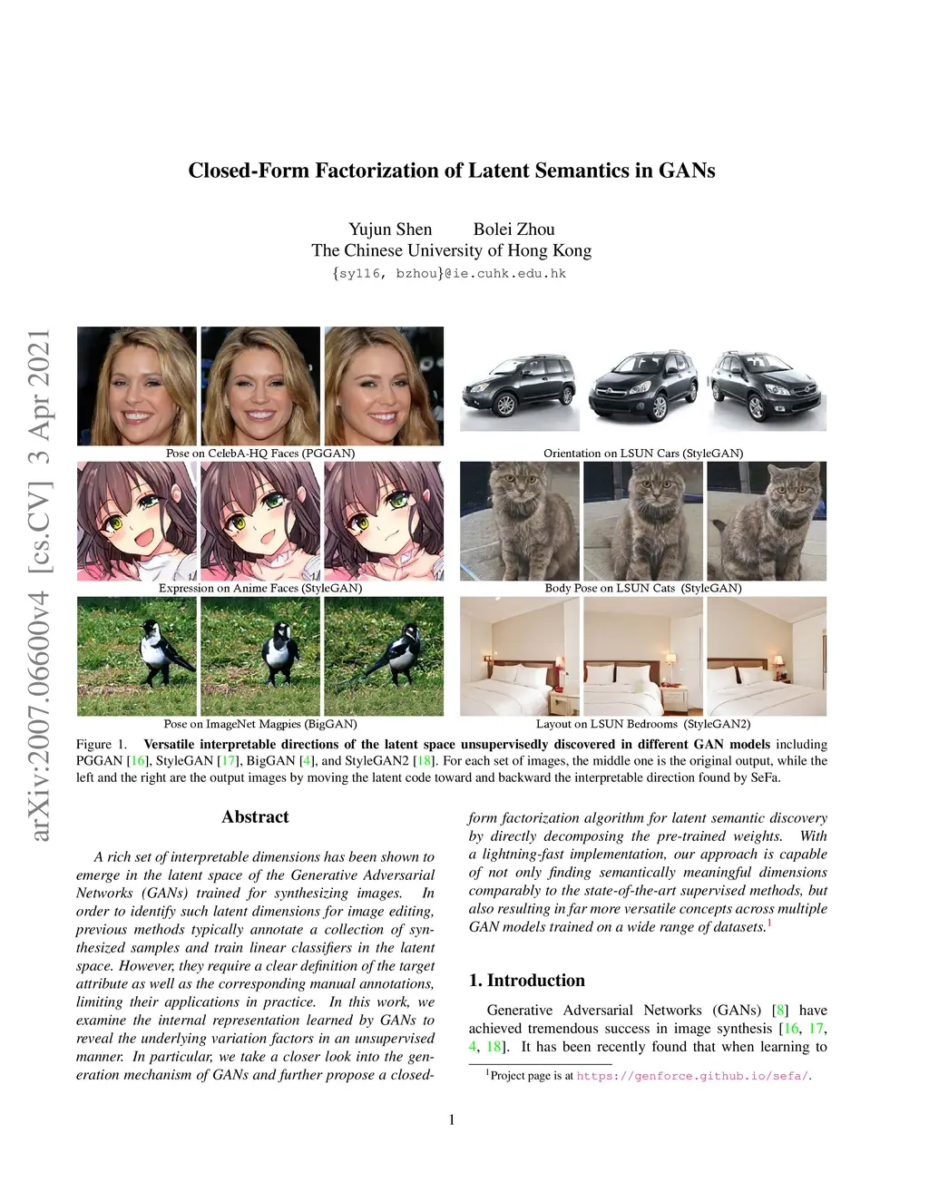 A rich set of interpretable dimensions has been shown to emerge in the latent space of the Generative Adversarial Networks (GANs) trained for synthesizing images. In order to identify such latent dimensions for image editing, previous methods typically annotate a collection of synthesized samples and train linear classifiers in the latent space. However, they require a clear definition of the target attribute as well as the corresponding manual annotations, limiting their applications in practice. In this work, we examine the internal representation learned by GANs to reveal the underlying variation factors in an unsupervised manner. In particular, we take a closer look into the generation mechanism of GANs and further propose a closed-form factorization algorithm for latent semantic discovery by directly decomposing the pre-trained weights. With a lightning-fast implementation, our approach is capable of not only finding semantically meaningful dimensions comparably to the state-of-the-art supervised methods, but also resulting in far more versatile concepts across multiple GAN models trained on a wide range of datasets.