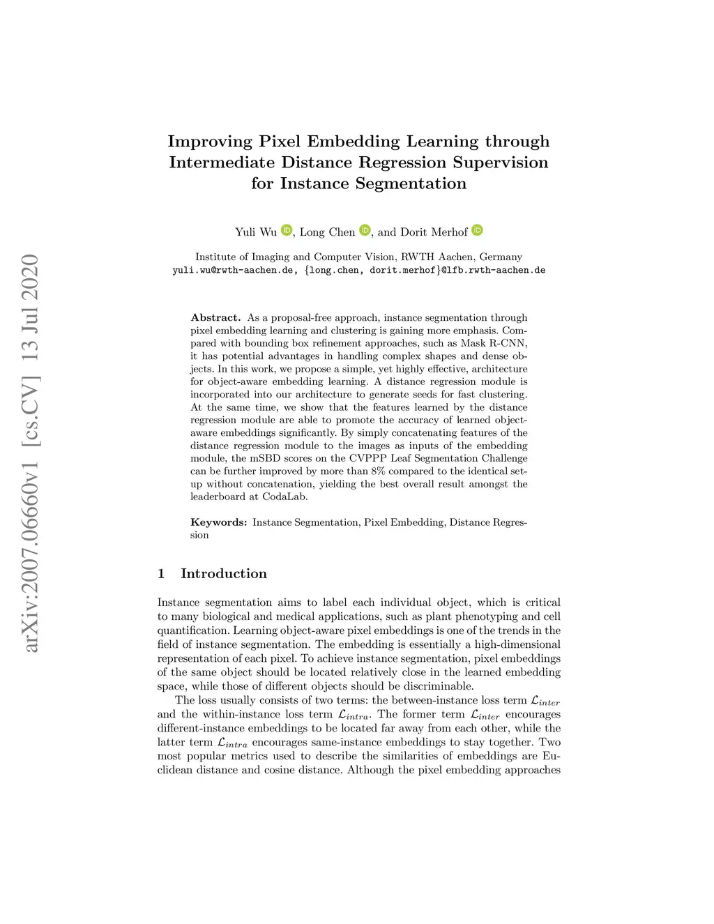 As a proposal-free approach, instance segmentation through pixel embedding learning and clustering is gaining more emphasis. Compared with bounding box refinement approaches, such as Mask R-CNN, it has potential advantages in handling complex shapes and dense objects. In this work, we propose a simple, yet highly effective, architecture for object-aware embedding learning. A distance regression module is incorporated into our architecture to generate seeds for fast clustering. At the same time, we show that the features learned by the distance regression module are able to promote the accuracy of learned object-aware embeddings significantly. By simply concatenating features of the distance regression module to the images as inputs of the embedding module, the mSBD scores on the CVPPP Leaf Segmentation Challenge can be further improved by more than 8% compared to the identical set-up without concatenation, yielding the best overall result amongst the leaderboard at CodaLab.