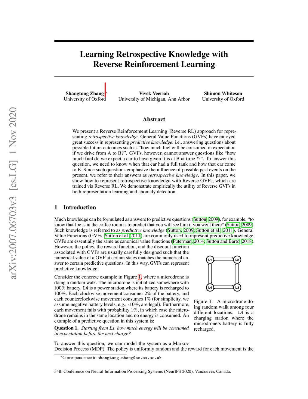 We present a Reverse Reinforcement Learning (Reverse RL) approach for representing retrospective knowledge. General Value Functions (GVFs) have enjoyed great success in representing predictive knowledge, i.e., answering questions about possible future outcomes such as "how much fuel will be consumed in expectation if we drive from A to B?". GVFs, however, cannot answer questions like "how much fuel do we expect a car to have given it is at B at time ?". To answer this question, we need to know when that car had a full tank and how that car came to B. Since such questions emphasize the influence of possible past events on the present, we refer to their answers as retrospective knowledge. In this paper, we show how to represent retrospective knowledge with Reverse GVFs, which are trained via Reverse RL. We demonstrate empirically the utility of Reverse GVFs in both representation learning and anomaly detection.