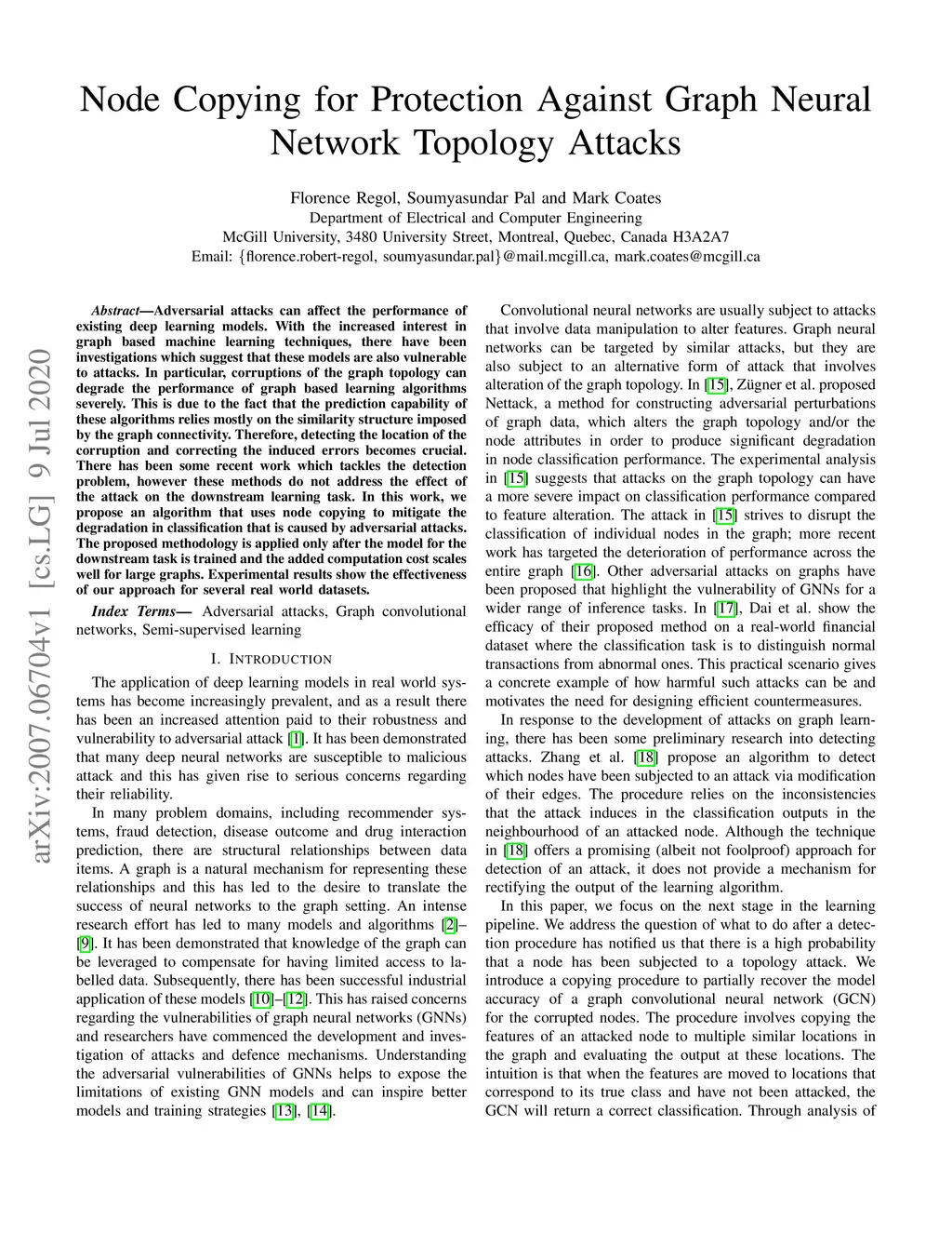 Adversarial attacks can affect the performance of existing deep learning models. With the increased interest in graph based machine learning techniques, there have been investigations which suggest that these models are also vulnerable to attacks. In particular, corruptions of the graph topology can degrade the performance of graph based learning algorithms severely. This is due to the fact that the prediction capability of these algorithms relies mostly on the similarity structure imposed by the graph connectivity. Therefore, detecting the location of the corruption and correcting the induced errors becomes crucial. There has been some recent work which tackles the detection problem, however these methods do not address the effect of the attack on the downstream learning task. In this work, we propose an algorithm that uses node copying to mitigate the degradation in classification that is caused by adversarial attacks. The proposed methodology is applied only after the model for the downstream task is trained and the added computation cost scales well for large graphs. Experimental results show the effectiveness of our approach for several real world datasets.