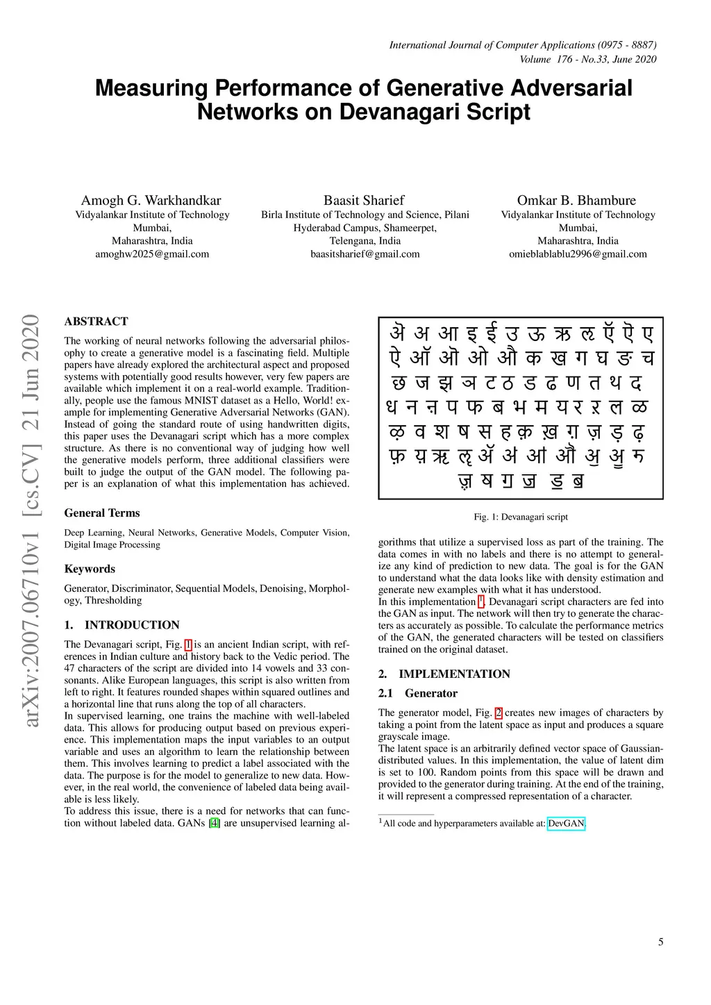 The working of neural networks following the adversarial philosophy to create a generative model is a fascinating field. Multiple papers have already explored the architectural aspect and proposed systems with potentially good results however, very few papers are available which implement it on a real-world example. Traditionally, people use the famous MNIST dataset as a Hello, World! example for implementing Generative Adversarial Networks (GAN). Instead of going the standard route of using handwritten digits, this paper uses the Devanagari script which has a more complex structure. As there is no conventional way of judging how well the generative models perform, three additional classifiers were built to judge the output of the GAN model. The following paper is an explanation of what this implementation has achieved.