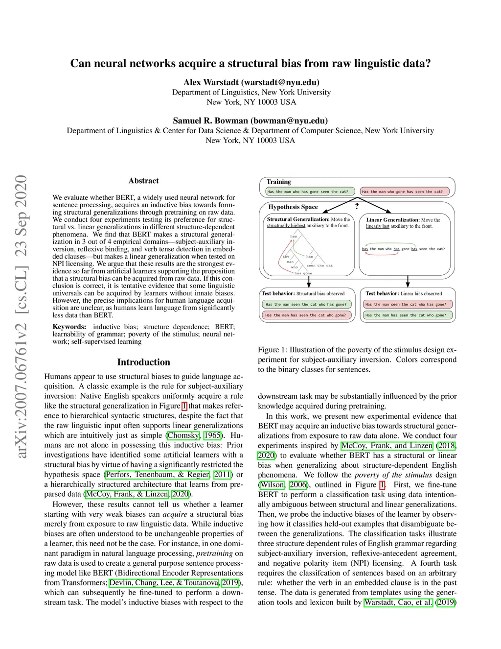 We evaluate whether BERT, a widely used neural network for sentence processing, acquires an inductive bias towards forming structural generalizations through pretraining on raw data. We conduct four experiments testing its preference for structural vs. linear generalizations in different structure-dependent phenomena. We find that BERT makes a structural generalization in 3 out of 4 empirical domains---subject-auxiliary inversion, reflexive binding, and verb tense detection in embedded clauses---but makes a linear generalization when tested on NPI licensing. We argue that these results are the strongest evidence so far from artificial learners supporting the proposition that a structural bias can be acquired from raw data. If this conclusion is correct, it is tentative evidence that some linguistic universals can be acquired by learners without innate biases. However, the precise implications for human language acquisition are unclear, as humans learn language from significantly less data than BERT.