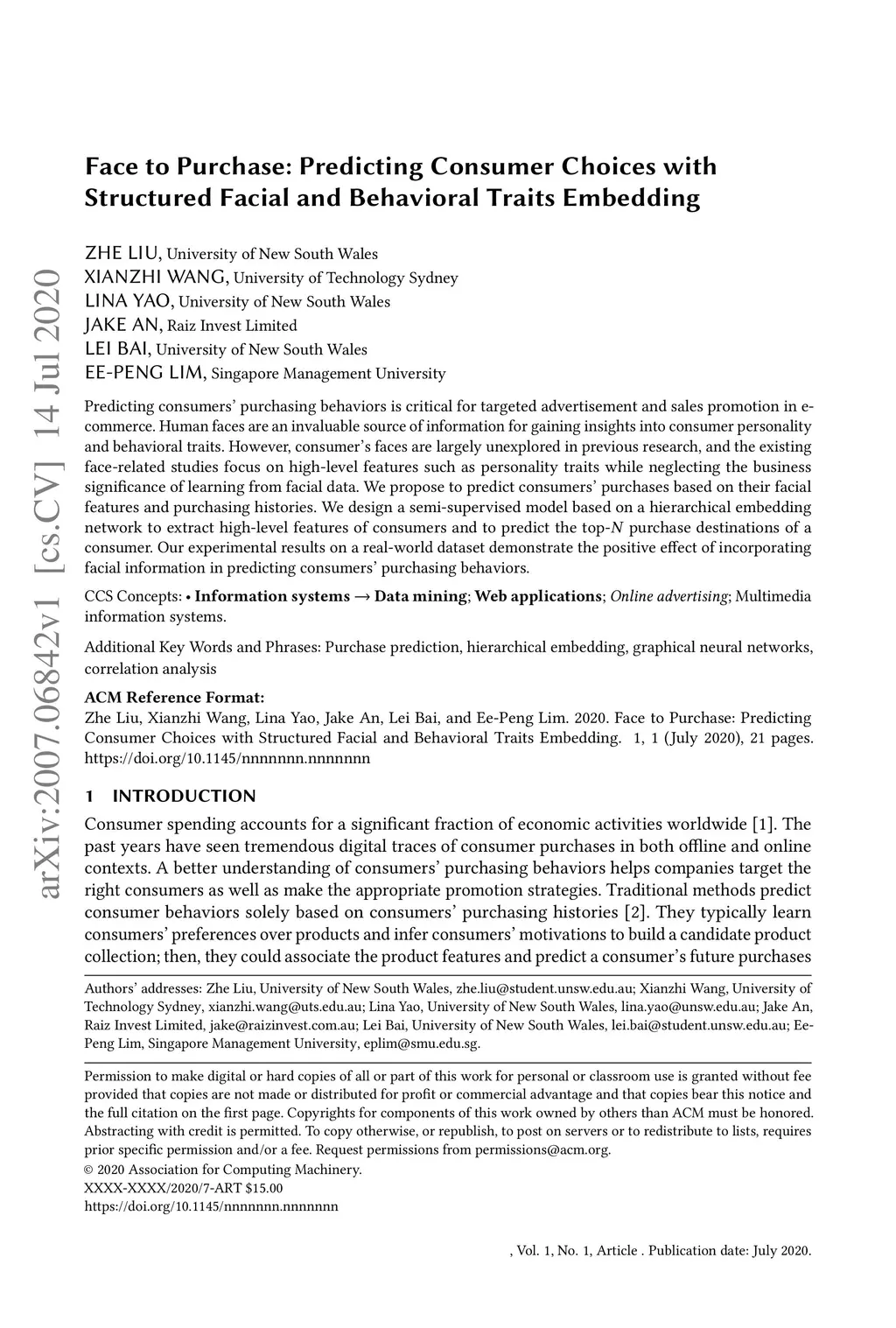 Predicting consumers' purchasing behaviors is critical for targeted advertisement and sales promotion in e-commerce. Human faces are an invaluable source of information for gaining insights into consumer personality and behavioral traits. However, consumer's faces are largely unexplored in previous research, and the existing face-related studies focus on high-level features such as personality traits while neglecting the business significance of learning from facial data. We propose to predict consumers' purchases based on their facial features and purchasing histories. We design a semi-supervised model based on a hierarchical embedding network to extract high-level features of consumers and to predict the top- purchase destinations of a consumer. Our experimental results on a real-world dataset demonstrate the positive effect of incorporating facial information in predicting consumers' purchasing behaviors.