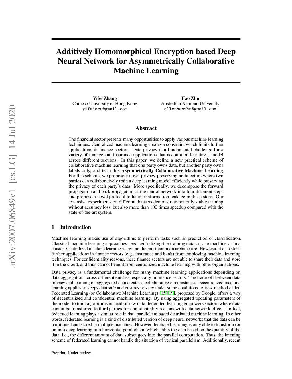 The financial sector presents many opportunities to apply various machine learning techniques. Centralized machine learning creates a constraint which limits further applications in finance sectors. Data privacy is a fundamental challenge for a variety of finance and insurance applications that account on learning a model across different sections. In this paper, we define a new practical scheme of collaborative machine learning that one party owns data, but another party owns labels only, and term this \textbf{Asymmetrically Collaborative Machine Learning}. For this scheme, we propose a novel privacy-preserving architecture where two parties can collaboratively train a deep learning model efficiently while preserving the privacy of each party's data. More specifically, we decompose the forward propagation and backpropagation of the neural network into four different steps and propose a novel protocol to handle information leakage in these steps. Our extensive experiments on different datasets demonstrate not only stable training without accuracy loss, but also more than 100 times speedup compared with the state-of-the-art system.