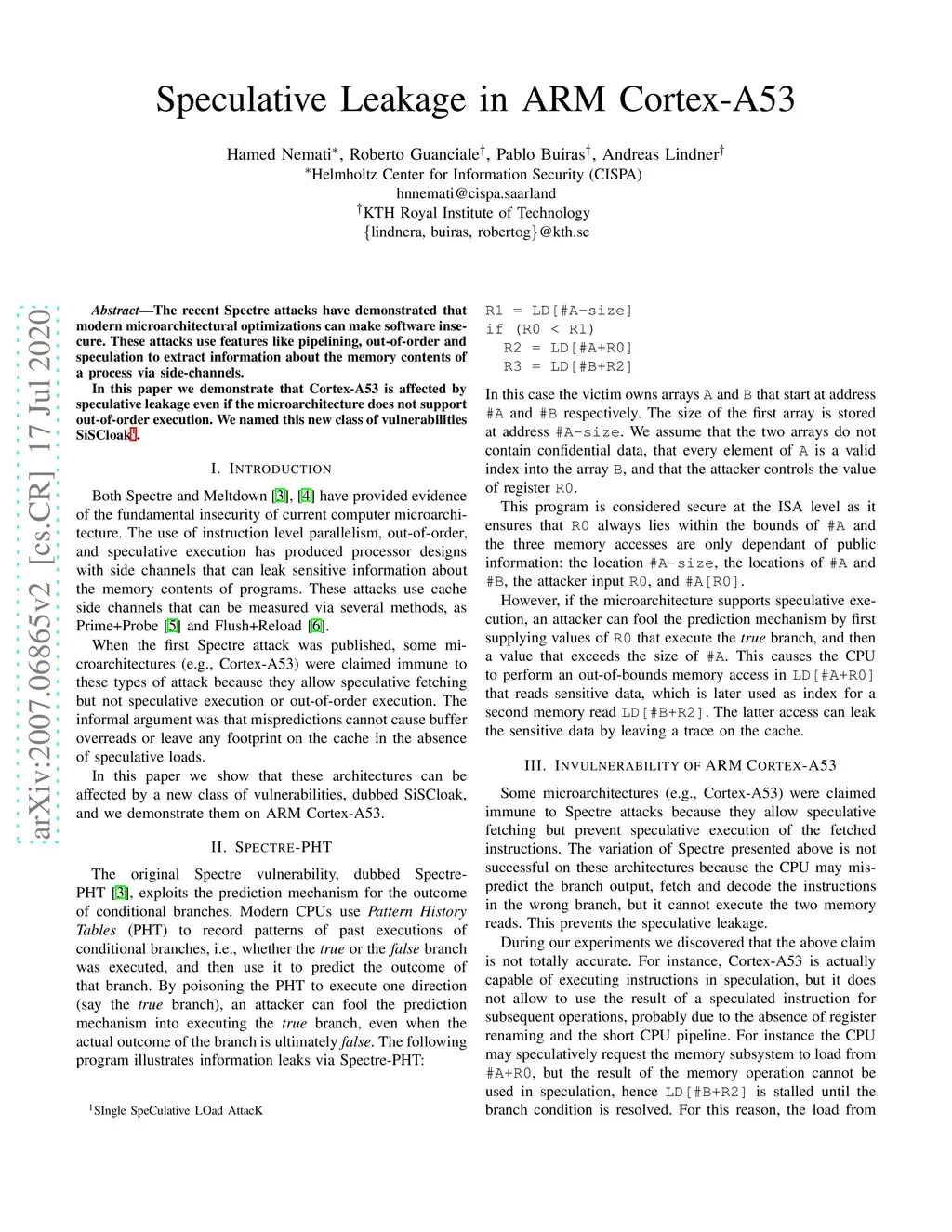 The recent Spectre attacks have demonstrated that modern microarchitectural optimizations can make software insecure. These attacks use features like pipelining, out-of-order and speculation to extract information about the memory contents of a process via side-channels. In this paper we demonstrate that Cortex-A53 is affected by speculative leakage even if the microarchitecture does not support out-of-order execution. We named this new class of vulnerabilities SiSCloak.