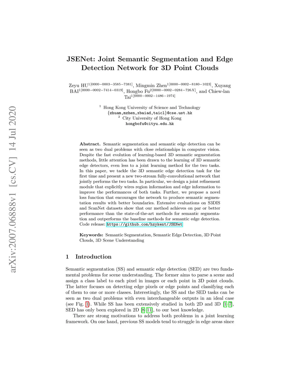 JSENet: Joint Semantic Segmentation and Edge Detection Network for 3D