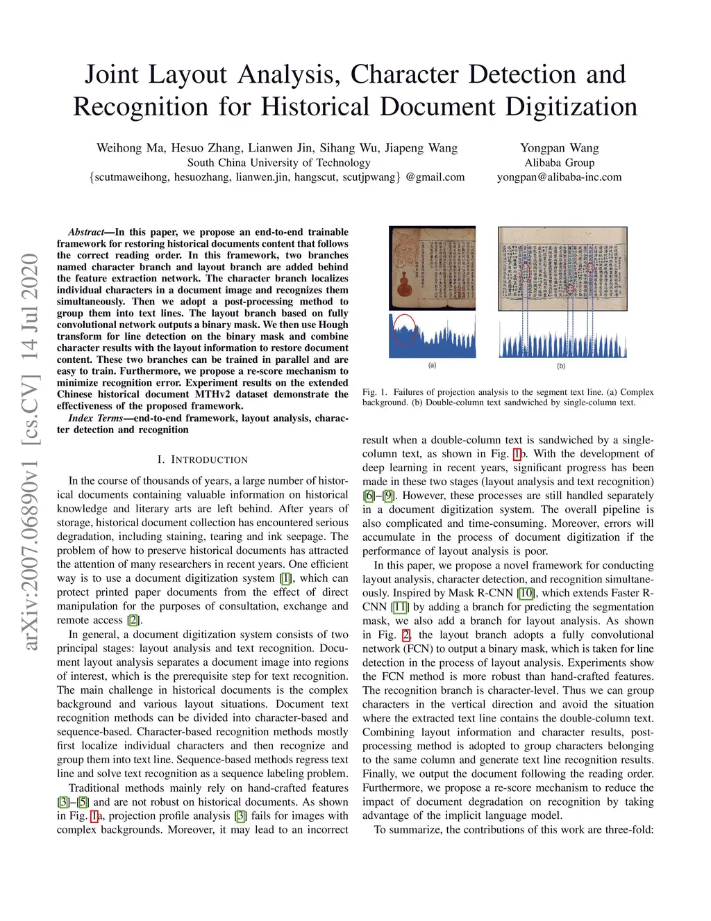 In this paper, we propose an end-to-end trainable framework for restoring historical documents content that follows the correct reading order. In this framework, two branches named character branch and layout branch are added behind the feature extraction network. The character branch localizes individual characters in a document image and recognizes them simultaneously. Then we adopt a post-processing method to group them into text lines. The layout branch based on fully convolutional network outputs a binary mask. We then use Hough transform for line detection on the binary mask and combine character results with the layout information to restore document content. These two branches can be trained in parallel and are easy to train. Furthermore, we propose a re-score mechanism to minimize recognition error. Experiment results on the extended Chinese historical document MTHv2 dataset demonstrate the effectiveness of the proposed framework.