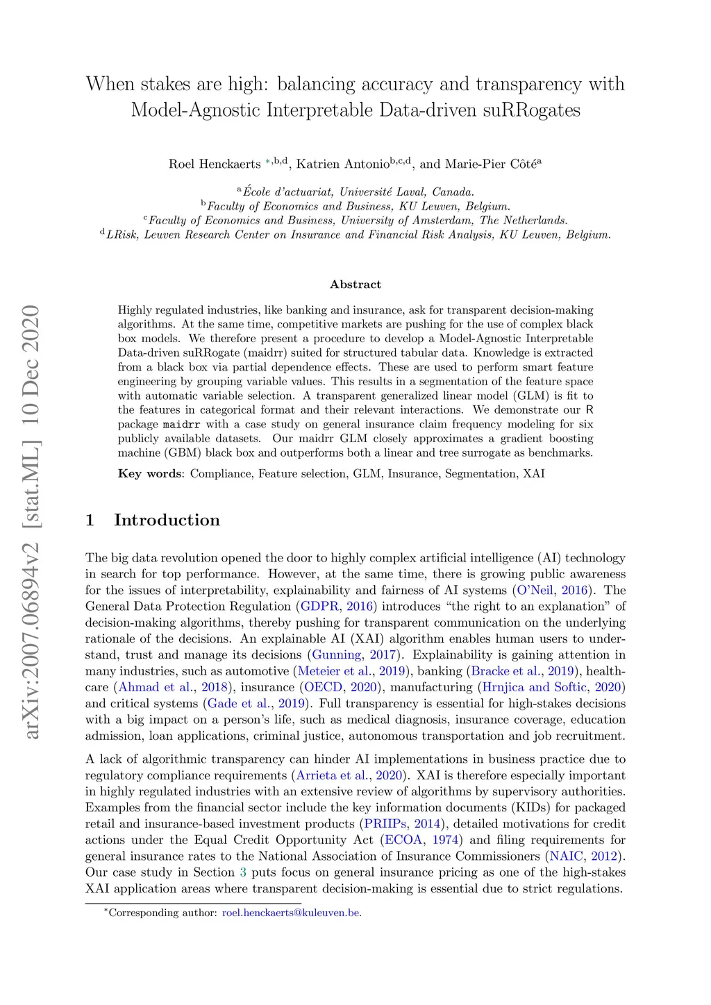 Highly regulated industries, like banking and insurance, ask for transparent decision-making algorithms. At the same time, competitive markets are pushing for the use of complex black box models. We therefore present a procedure to develop a Model-Agnostic Interpretable Data-driven suRRogate (maidrr) suited for structured tabular data. Knowledge is extracted from a black box via partial dependence effects. These are used to perform smart feature engineering by grouping variable values. This results in a segmentation of the feature space with automatic variable selection. A transparent generalized linear model (GLM) is fit to the features in categorical format and their relevant interactions. We demonstrate our R package maidrr with a case study on general insurance claim frequency modeling for six publicly available datasets. Our maidrr GLM closely approximates a gradient boosting machine (GBM) black box and outperforms both a linear and tree surrogate as benchmarks.