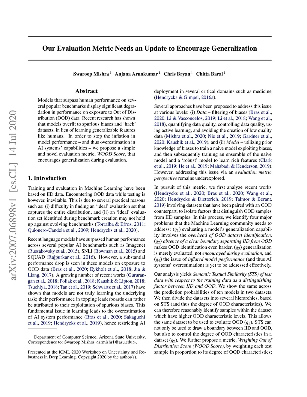 Models that surpass human performance on several popular benchmarks display significant degradation in performance on exposure to Out of Distribution (OOD) data. Recent research has shown that models overfit to spurious biases and `hack' datasets, in lieu of learning generalizable features like humans. In order to stop the inflation in model performance -- and thus overestimation in AI systems' capabilities -- we propose a simple and novel evaluation metric, WOOD Score, that encourages generalization during evaluation.