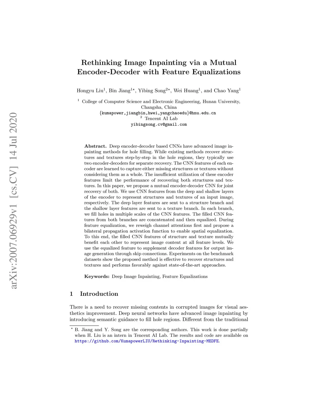 Rethinking Image Inpainting via a Mutual Encoder-Decoder with Feature