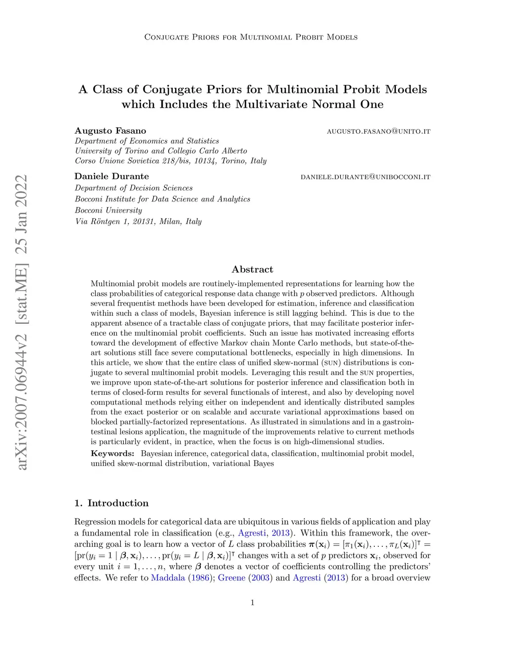 Multinomial probit models are routinely-implemented representations for learning how the class probabilities of categorical response data change with p observed predictors. Although several frequentist methods have been developed for estimation, inference and classification within such a class of models, Bayesian inference is still lagging behind. This is due to the apparent absence of a tractable class of conjugate priors, that may facilitate posterior inference on the multinomial probit coefficients. Such an issue has motivated increasing efforts toward the development of effective Markov chain Monte Carlo methods, but state-of-the-art solutions still face severe computational bottlenecks, especially in high dimensions. In this article, we show that the entire class of unified skew-normal (SUN) distributions is conjugate to several multinomial probit models. Leveraging this result and the SUN properties, we improve upon state-of-the-art solutions for posterior inference and classification both in terms of closed-form results for several functionals of interest, and also by developing novel computational methods relying either on independent and identically distributed samples from the exact posterior or on scalable and accurate variational approximations based on blocked partially-factorized representations. As illustrated in simulations and in a gastrointestinal lesions application, the magnitude of the improvements relative to current methods is particularly evident, in practice, when the focus is on high-dimensional studies.