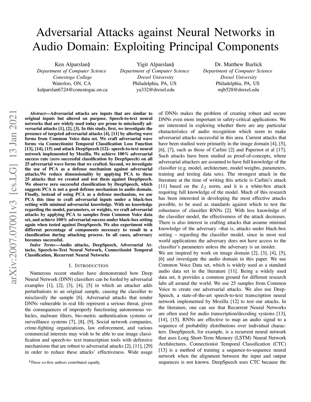 Adversarial attacks are inputs that are similar to original inputs but altered on purpose. Speech-to-text neural networks that are widely used today are prone to misclassify adversarial attacks. In this study, first, we investigate the presence of targeted adversarial attacks by altering wave forms from Common Voice data set. We craft adversarial wave forms via Connectionist Temporal Classification Loss Function, and attack DeepSpeech, a speech-to-text neural network implemented by Mozilla. We achieve 100% adversarial success rate (zero successful classification by DeepSpeech) on all 25 adversarial wave forms that we crafted. Second, we investigate the use of PCA as a defense mechanism against adversarial attacks. We reduce dimensionality by applying PCA to these 25 attacks that we created and test them against DeepSpeech. We observe zero successful classification by DeepSpeech, which suggests PCA is not a good defense mechanism in audio domain. Finally, instead of using PCA as a defense mechanism, we use PCA this time to craft adversarial inputs under a black-box setting with minimal adversarial knowledge. With no knowledge regarding the model, parameters, or weights, we craft adversarial attacks by applying PCA to samples from Common Voice data set and achieve 100% adversarial success under black-box setting again when tested against DeepSpeech. We also experiment with different percentage of components necessary to result in a classification during attacking process. In all cases, adversary becomes successful.