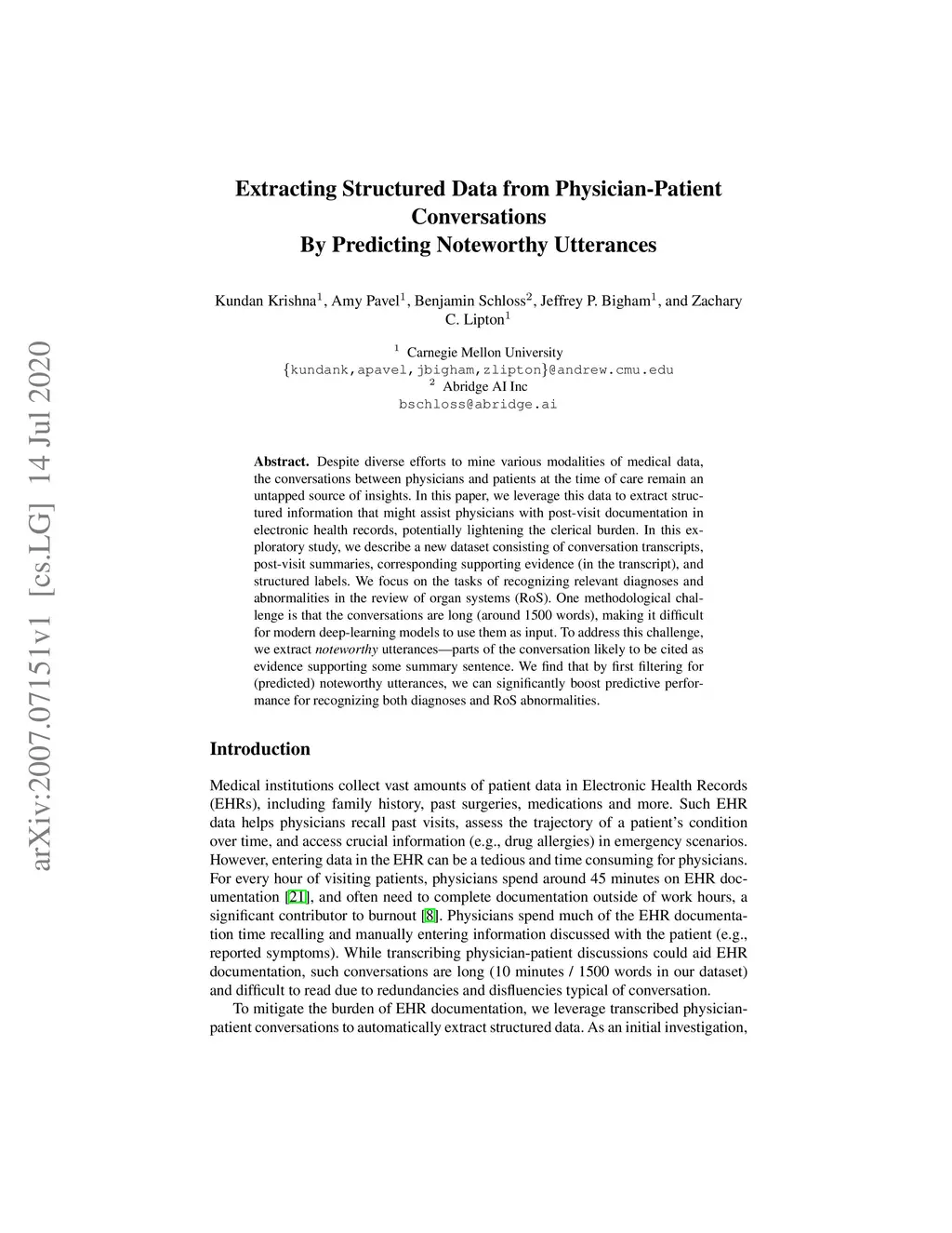 Despite diverse efforts to mine various modalities of medical data, the conversations between physicians and patients at the time of care remain an untapped source of insights. In this paper, we leverage this data to extract structured information that might assist physicians with post-visit documentation in electronic health records, potentially lightening the clerical burden. In this exploratory study, we describe a new dataset consisting of conversation transcripts, post-visit summaries, corresponding supporting evidence (in the transcript), and structured labels. We focus on the tasks of recognizing relevant diagnoses and abnormalities in the review of organ systems (RoS). One methodological challenge is that the conversations are long (around 1500 words), making it difficult for modern deep-learning models to use them as input. To address this challenge, we extract noteworthy utterances---parts of the conversation likely to be cited as evidence supporting some summary sentence. We find that by first filtering for (predicted) noteworthy utterances, we can significantly boost predictive performance for recognizing both diagnoses and RoS abnormalities.