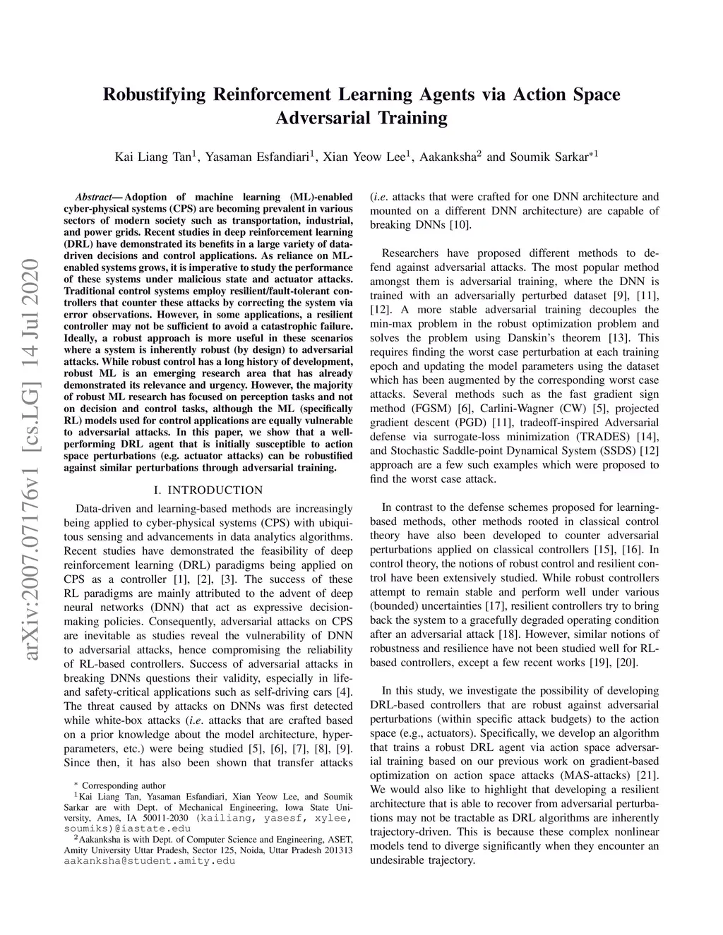 Adoption of machine learning (ML)-enabled cyber-physical systems (CPS) are becoming prevalent in various sectors of modern society such as transportation, industrial, and power grids. Recent studies in deep reinforcement learning (DRL) have demonstrated its benefits in a large variety of data-driven decisions and control applications. As reliance on ML-enabled systems grows, it is imperative to study the performance of these systems under malicious state and actuator attacks. Traditional control systems employ resilient/fault-tolerant controllers that counter these attacks by correcting the system via error observations. However, in some applications, a resilient controller may not be sufficient to avoid a catastrophic failure. Ideally, a robust approach is more useful in these scenarios where a system is inherently robust (by design) to adversarial attacks. While robust control has a long history of development, robust ML is an emerging research area that has already demonstrated its relevance and urgency. However, the majority of robust ML research has focused on perception tasks and not on decision and control tasks, although the ML (specifically RL) models used for control applications are equally vulnerable to adversarial attacks. In this paper, we show that a well-performing DRL agent that is initially susceptible to action space perturbations (e.g. actuator attacks) can be robustified against similar perturbations through adversarial training.