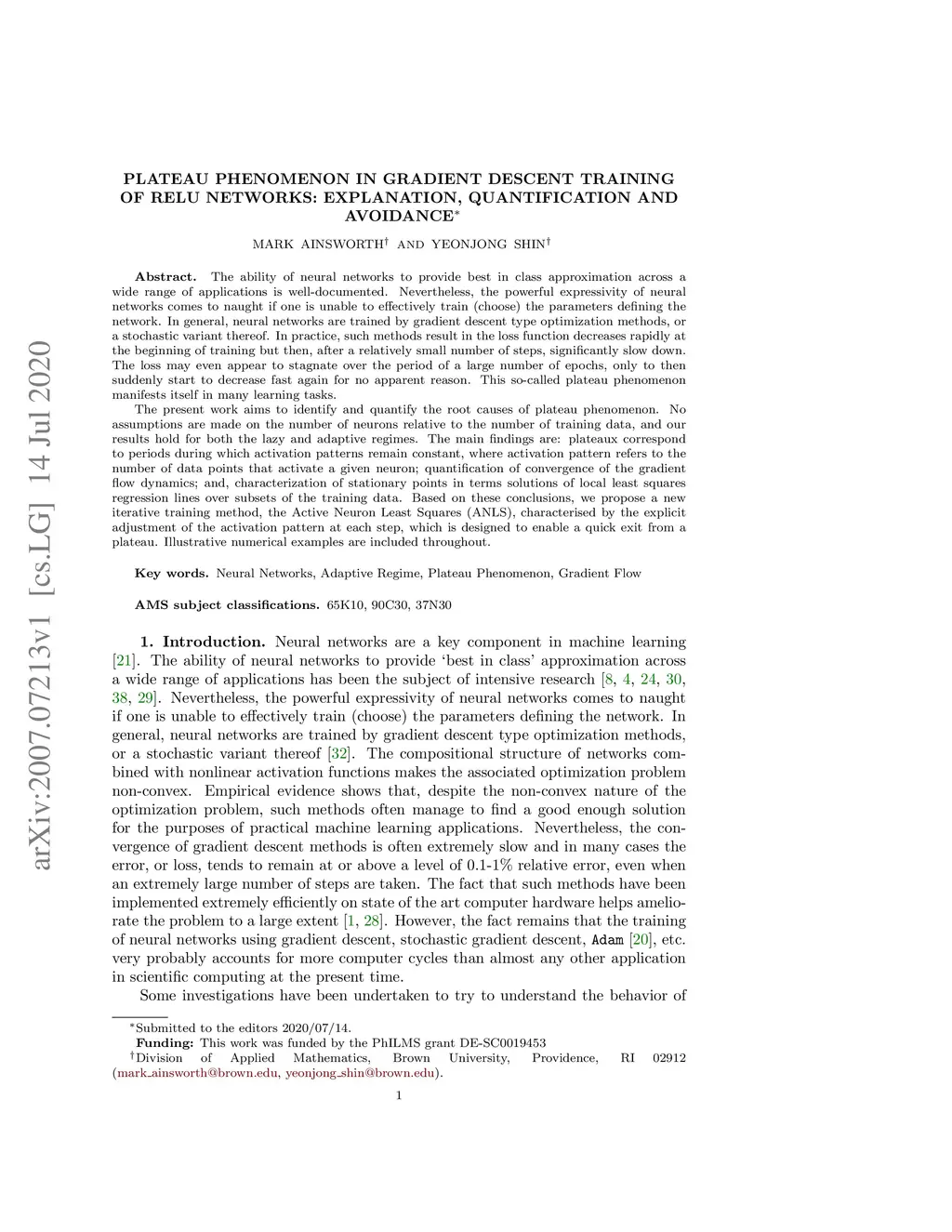 The ability of neural networks to provide `best in class' approximation across a wide range of applications is well-documented. Nevertheless, the powerful expressivity of neural networks comes to naught if one is unable to effectively train (choose) the parameters defining the network. In general, neural networks are trained by gradient descent type optimization methods, or a stochastic variant thereof. In practice, such methods result in the loss function decreases rapidly at the beginning of training but then, after a relatively small number of steps, significantly slow down. The loss may even appear to stagnate over the period of a large number of epochs, only to then suddenly start to decrease fast again for no apparent reason. This so-called plateau phenomenon manifests itself in many learning tasks. The present work aims to identify and quantify the root causes of plateau phenomenon. No assumptions are made on the number of neurons relative to the number of training data, and our results hold for both the lazy and adaptive regimes. The main findings are: plateaux correspond to periods during which activation patterns remain constant, where activation pattern refers to the number of data points that activate a given neuron; quantification of convergence of the gradient flow dynamics; and, characterization of stationary points in terms solutions of local least squares regression lines over subsets of the training data. Based on these conclusions, we propose a new iterative training method, the Active Neuron Least Squares (ANLS), characterised by the explicit adjustment of the activation pattern at each step, which is designed to enable a quick exit from a plateau. Illustrative numerical examples are included throughout.