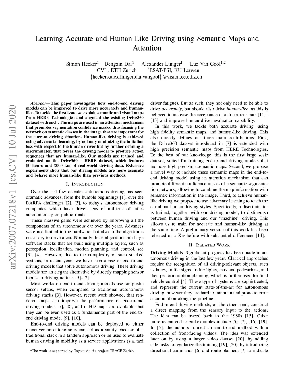 This paper investigates how end-to-end driving models can be improved to drive more accurately and human-like. To tackle the first issue we exploit semantic and visual maps from HERE Technologies and augment the existing Drive360 dataset with such. The maps are used in an attention mechanism that promotes segmentation confidence masks, thus focusing the network on semantic classes in the image that are important for the current driving situation. Human-like driving is achieved using adversarial learning, by not only minimizing the imitation loss with respect to the human driver but by further defining a discriminator, that forces the driving model to produce action sequences that are human-like. Our models are trained and evaluated on the Drive360 + HERE dataset, which features 60 hours and 3000 km of real-world driving data. Extensive experiments show that our driving models are more accurate and behave more human-like than previous methods.