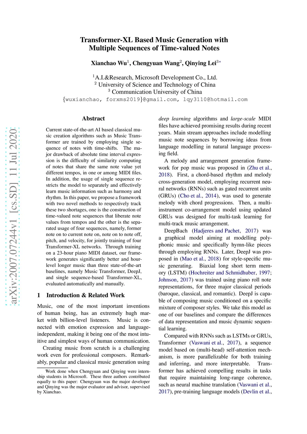 Transformer-XL Based Music Generation with Multiple Sequences of