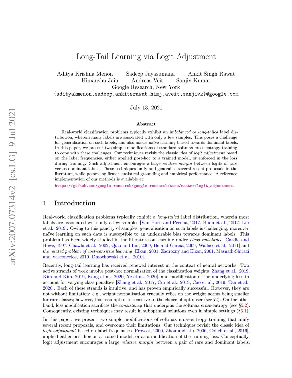 Real-world classification problems typically exhibit an imbalanced or long-tailed label distribution, wherein many labels are associated with only a few samples. This poses a challenge for generalisation on such labels, and also makes na\"ive learning biased towards dominant labels. In this paper, we present two simple modifications of standard softmax cross-entropy training to cope with these challenges. Our techniques revisit the classic idea of logit adjustment based on the label frequencies, either applied post-hoc to a trained model, or enforced in the loss during training. Such adjustment encourages a large relative margin between logits of rare versus dominant labels. These techniques unify and generalise several recent proposals in the literature, while possessing firmer statistical grounding and empirical performance.