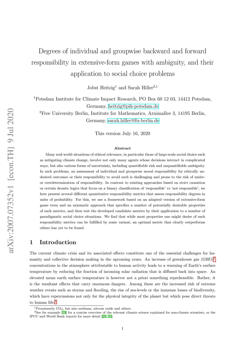 Many real-world situations of ethical relevance, in particular those of large-scale social choice such as mitigating climate change, involve not only many agents whose decisions interact in complicated ways, but also various forms of uncertainty, including quantifiable risk and unquantifiable ambiguity. In such problems, an assessment of individual and groupwise moral responsibility for ethically undesired outcomes or their responsibility to avoid such is challenging and prone to the risk of under- or overdetermination of responsibility. In contrast to existing approaches based on strict causation or certain deontic logics that focus on a binary classification of `responsible' vs `not responsible', we here present several different quantitative responsibility metrics that assess responsibility degrees in units of probability. For this, we use a framework based on an adapted version of extensive-form game trees and an axiomatic approach that specifies a number of potentially desirable properties of such metrics, and then test the developed candidate metrics by their application to a number of paradigmatic social choice situations. We find that while most properties one might desire of such responsibility metrics can be fulfilled by some variant, an optimal metric that clearly outperforms others has yet to be found.