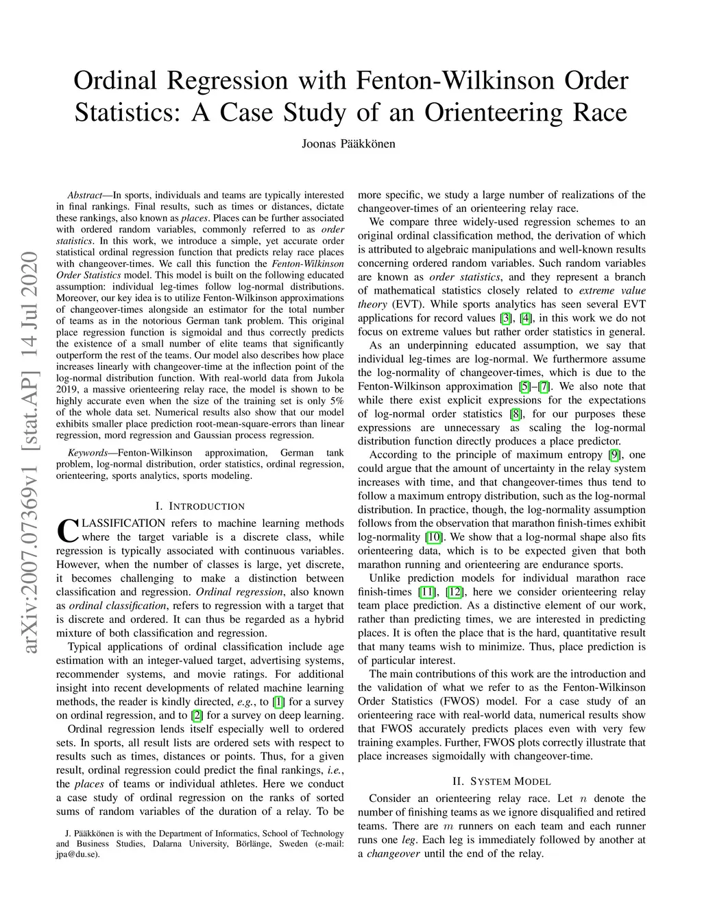 In sports, individuals and teams are typically interested in final rankings. Final results, such as times or distances, dictate these rankings, also known as places. Places can be further associated with ordered random variables, commonly referred to as order statistics. In this work, we introduce a simple, yet accurate order statistical ordinal regression function that predicts relay race places with changeover-times. We call this function the Fenton-Wilkinson Order Statistics model. This model is built on the following educated assumption: individual leg-times follow log-normal distributions. Moreover, our key idea is to utilize Fenton-Wilkinson approximations of changeover-times alongside an estimator for the total number of teams as in the notorious German tank problem. This original place regression function is sigmoidal and thus correctly predicts the existence of a small number of elite teams that significantly outperform the rest of the teams. Our model also describes how place increases linearly with changeover-time at the inflection point of the log-normal distribution function. With real-world data from Jukola 2019, a massive orienteering relay race, the model is shown to be highly accurate even when the size of the training set is only 5% of the whole data set. Numerical results also show that our model exhibits smaller place prediction root-mean-square-errors than linear regression, mord regression and Gaussian process regression.