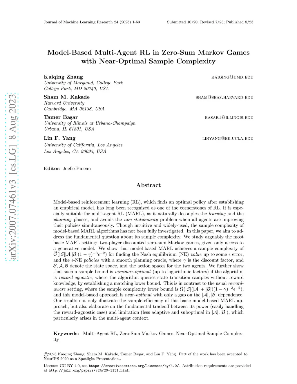 Model-based reinforcement learning (RL), which finds an optimal policy using an empirical model, has long been recognized as one of the corner stones of RL. It is especially suitable for multi-agent RL (MARL), as it naturally decouples the learning and the planning phases, and avoids the non-stationarity problem when all agents are improving their policies simultaneously using samples. Though intuitive and widely-used, the sample complexity of model-based MARL algorithms has not been fully investigated. In this paper, our goal is to address the fundamental question about its sample complexity. We study arguably the most basic MARL setting: two-player discounted zero-sum Markov games, given only access to a generative model. We show that model-based MARL achieves a sample complexity of for finding the Nash equilibrium (NE) value up to some error, and the -NE policies with a smooth planning oracle, where is the discount factor, and denote the state space, and the action spaces for the two agents. We further show that such a sample bound is minimax-optimal (up to logarithmic factors) if the algorithm is reward-agnostic, where the algorithm queries state transition samples without reward knowledge, by establishing a matching lower bound. This is in contrast to the usual reward-aware setting, with a lower bound, where this model-based approach is near-optimal with only a gap on the dependence. Our results not only demonstrate the sample-efficiency of this basic model-based approach in MARL, but also elaborate on the fundamental tradeoff between its power (easily handling the more challenging reward-agnostic case) and limitation (less adaptive and suboptimal in ), particularly arises in the multi-agent context.