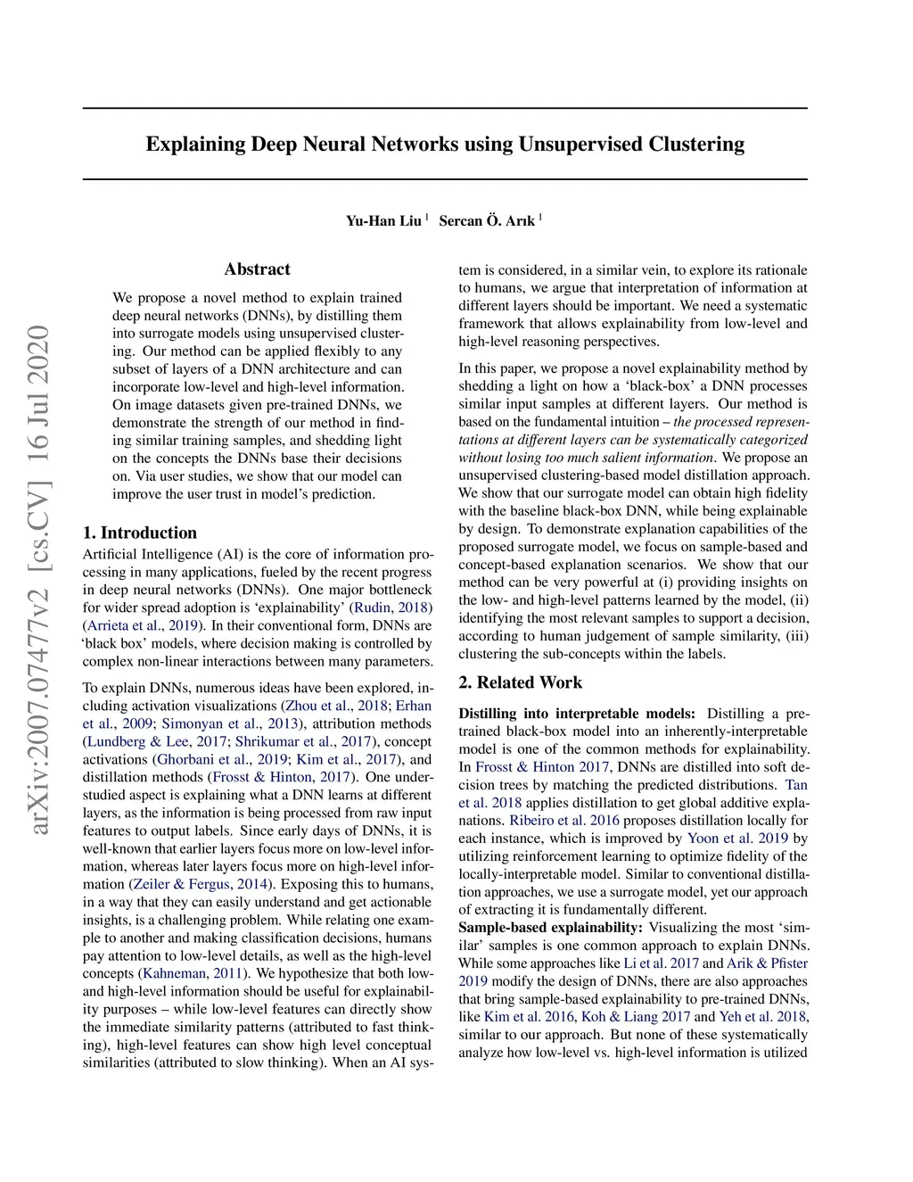 We propose a novel method to explain trained deep neural networks (DNNs), by distilling them into surrogate models using unsupervised clustering. Our method can be applied flexibly to any subset of layers of a DNN architecture and can incorporate low-level and high-level information. On image datasets given pre-trained DNNs, we demonstrate the strength of our method in finding similar training samples, and shedding light on the concepts the DNNs base their decisions on. Via user studies, we show that our model can improve the user trust in model's prediction.