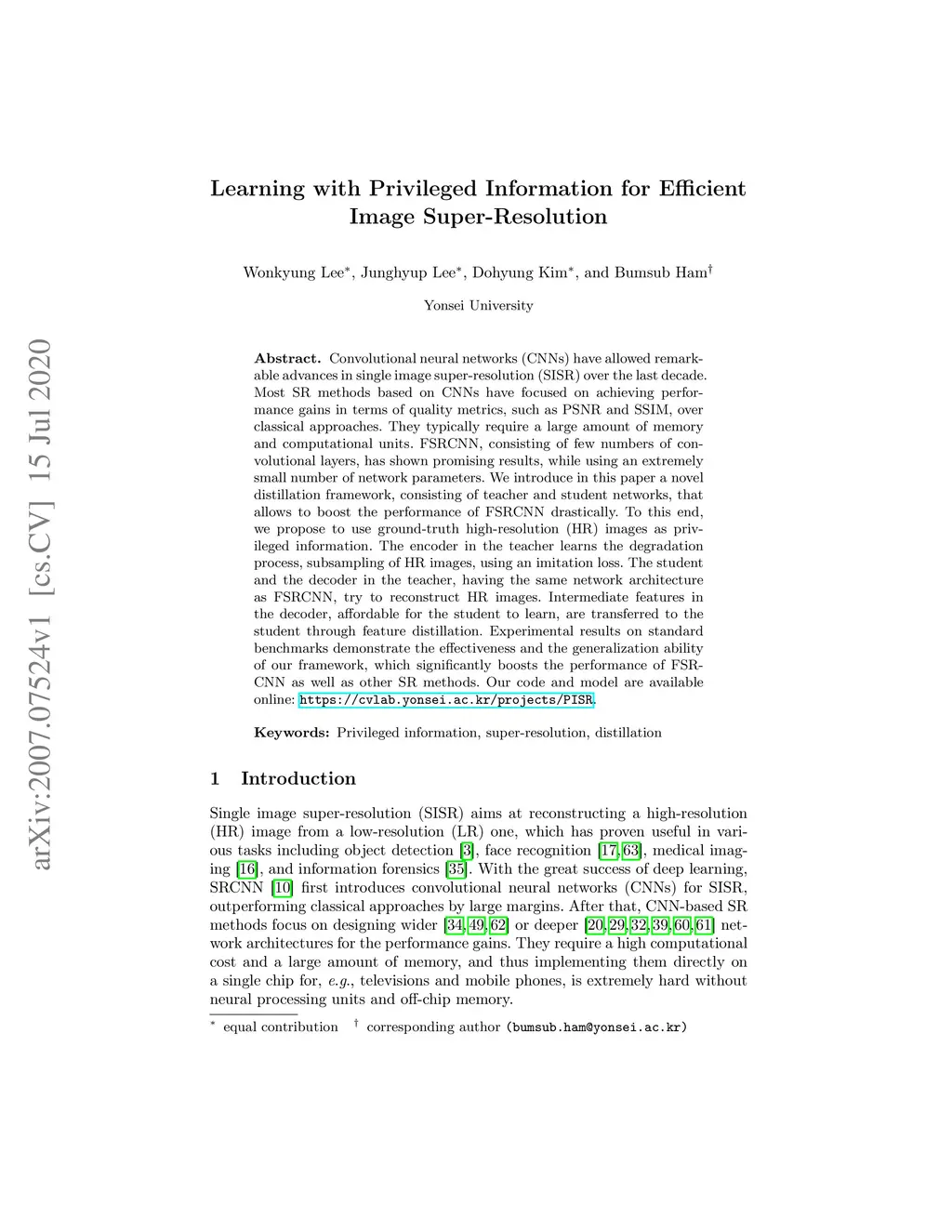 Convolutional neural networks (CNNs) have allowed remarkable advances in single image super-resolution (SISR) over the last decade. Most SR methods based on CNNs have focused on achieving performance gains in terms of quality metrics, such as PSNR and SSIM, over classical approaches. They typically require a large amount of memory and computational units. FSRCNN, consisting of few numbers of convolutional layers, has shown promising results, while using an extremely small number of network parameters. We introduce in this paper a novel distillation framework, consisting of teacher and student networks, that allows to boost the performance of FSRCNN drastically. To this end, we propose to use ground-truth high-resolution (HR) images as privileged information. The encoder in the teacher learns the degradation process, subsampling of HR images, using an imitation loss. The student and the decoder in the teacher, having the same network architecture as FSRCNN, try to reconstruct HR images. Intermediate features in the decoder, affordable for the student to learn, are transferred to the student through feature distillation. Experimental results on standard benchmarks demonstrate the effectiveness and the generalization ability of our framework, which significantly boosts the performance of FSRCNN as well as other SR methods. Our code and model are available online: https://cvlab.yonsei.ac.kr/projects/PISR.