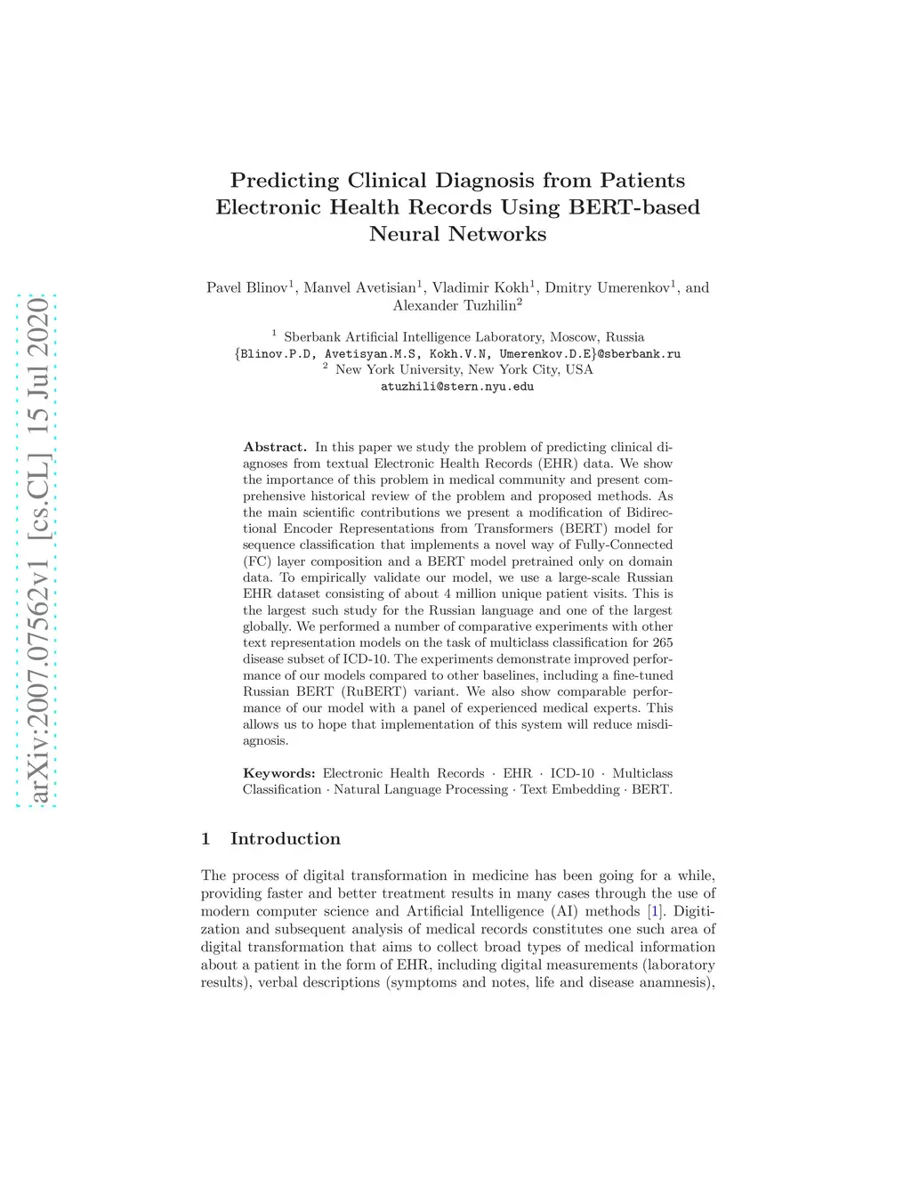In this paper we study the problem of predicting clinical diagnoses from textual Electronic Health Records (EHR) data. We show the importance of this problem in medical community and present comprehensive historical review of the problem and proposed methods. As the main scientific contributions we present a modification of Bidirectional Encoder Representations from Transformers (BERT) model for sequence classification that implements a novel way of Fully-Connected (FC) layer composition and a BERT model pretrained only on domain data. To empirically validate our model, we use a large-scale Russian EHR dataset consisting of about 4 million unique patient visits. This is the largest such study for the Russian language and one of the largest globally. We performed a number of comparative experiments with other text representation models on the task of multiclass classification for 265 disease subset of ICD-10. The experiments demonstrate improved performance of our models compared to other baselines, including a fine-tuned Russian BERT (RuBERT) variant. We also show comparable performance of our model with a panel of experienced medical experts. This allows us to hope that implementation of this system will reduce misdiagnosis.