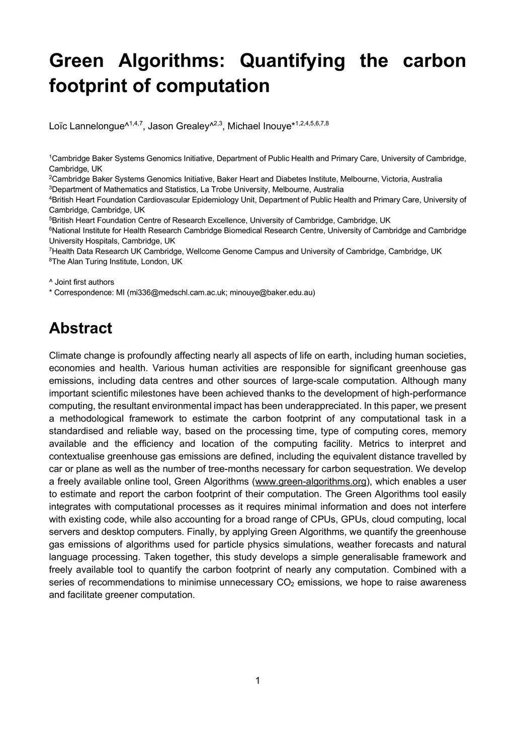 Climate change is profoundly affecting nearly all aspects of life on earth, including human societies, economies and health. Various human activities are responsible for significant greenhouse gas emissions, including data centres and other sources of large-scale computation. Although many important scientific milestones have been achieved thanks to the development of high-performance computing, the resultant environmental impact has been underappreciated. In this paper, we present a methodological framework to estimate the carbon footprint of any computational task in a standardised and reliable way, based on the processing time, type of computing cores, memory available and the efficiency and location of the computing facility. Metrics to interpret and contextualise greenhouse gas emissions are defined, including the equivalent distance travelled by car or plane as well as the number of tree-months necessary for carbon sequestration. We develop a freely available online tool, Green Algorithms (www.green-algorithms.org), which enables a user to estimate and report the carbon footprint of their computation. The Green Algorithms tool easily integrates with computational processes as it requires minimal information and does not interfere with existing code, while also accounting for a broad range of CPUs, GPUs, cloud computing, local servers and desktop computers. Finally, by applying Green Algorithms, we quantify the greenhouse gas emissions of algorithms used for particle physics simulations, weather forecasts and natural language processing. Taken together, this study develops a simple generalisable framework and freely available tool to quantify the carbon footprint of nearly any computation. Combined with a series of recommendations to minimise unnecessary CO2 emissions, we hope to raise awareness and facilitate greener computation.