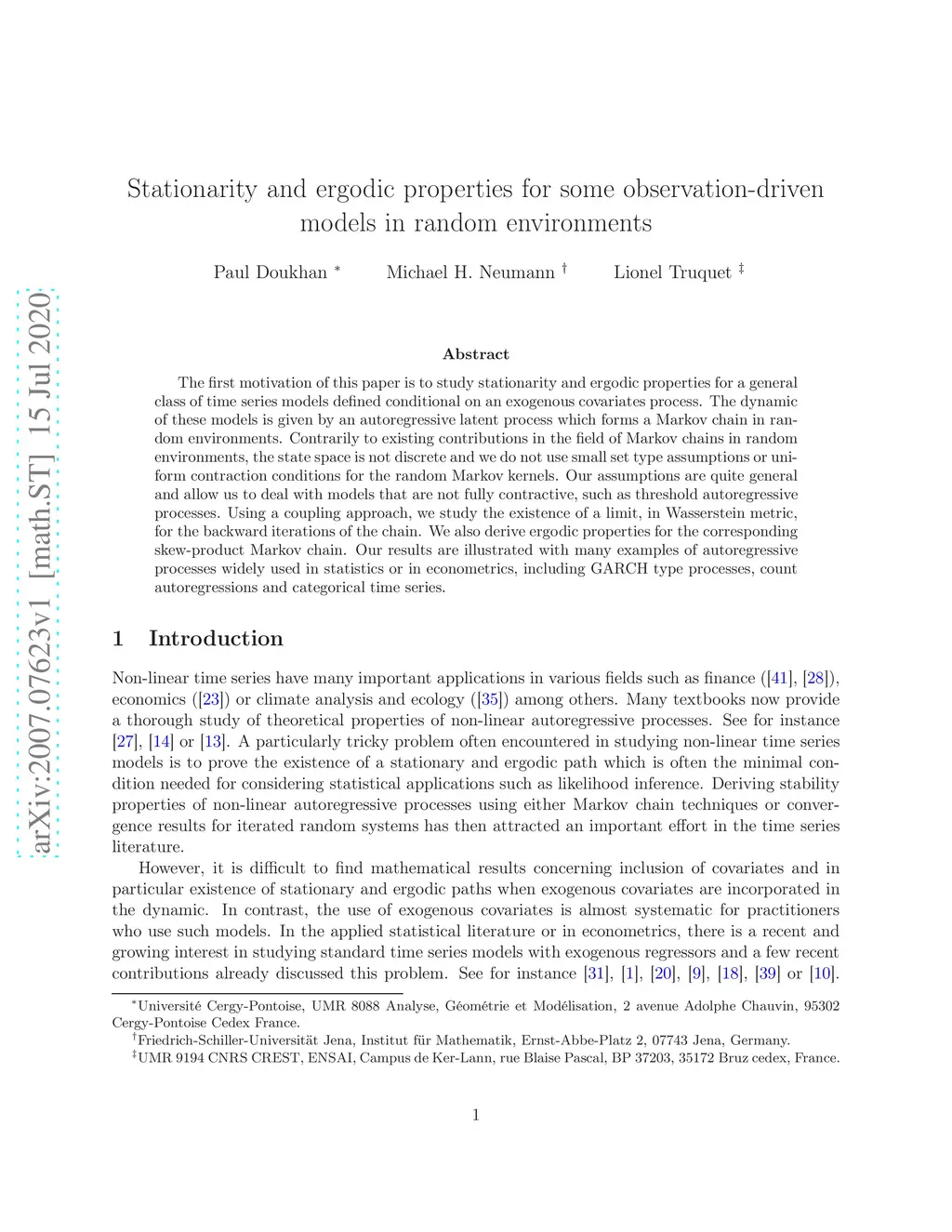 The first motivation of this paper is to study stationarity and ergodic properties for a general class of time series models defined conditional on an exogenous covariates process. The dynamic of these models is given by an autoregressive latent process which forms a Markov chain in random environments. Contrarily to existing contributions in the field of Markov chains in random environments, the state space is not discrete and we do not use small set type assumptions or uniform contraction conditions for the random Markov kernels. Our assumptions are quite general and allows to deal with models that are not fully contractive, such as threshold autoregressive processes. Using a coupling approach, we study the existence of a limit, in Wasserstein metric, for the backward iterations of the chain. We also derive ergodic properties for the corresponding skew-product Markov chain. Our results are illustrated with many examples of autoregressive processes widely used in statistics or in econometrics, including GARCH type processes, count autoregressions and categorical time series.