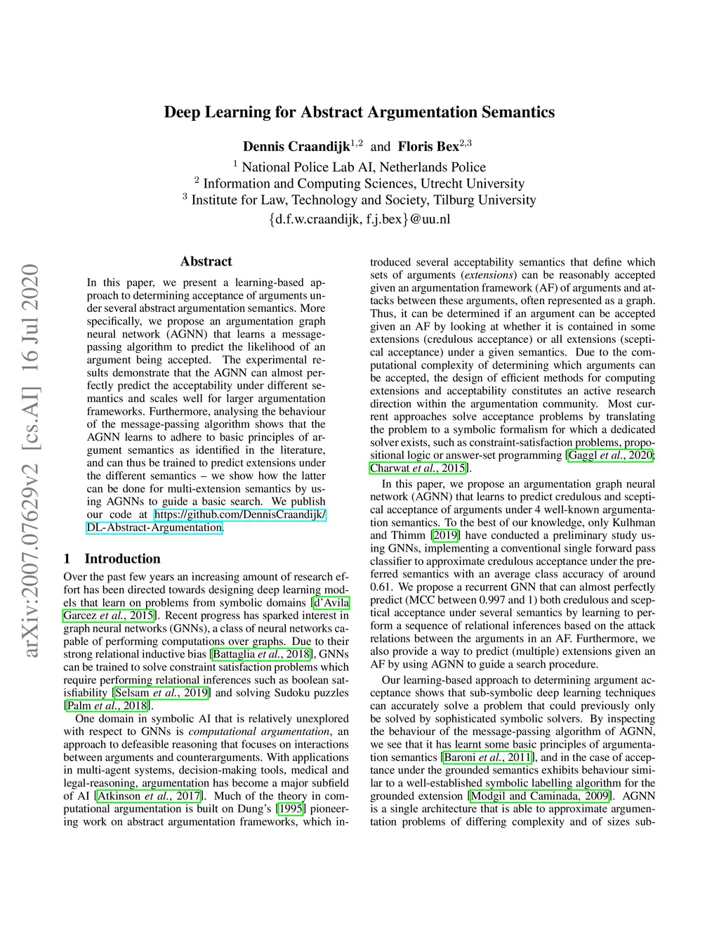 In this paper, we present a learning-based approach to determining acceptance of arguments under several abstract argumentation semantics. More specifically, we propose an argumentation graph neural network (AGNN) that learns a message-passing algorithm to predict the likelihood of an argument being accepted. The experimental results demonstrate that the AGNN can almost perfectly predict the acceptability under different semantics and scales well for larger argumentation frameworks. Furthermore, analysing the behaviour of the message-passing algorithm shows that the AGNN learns to adhere to basic principles of argument semantics as identified in the literature, and can thus be trained to predict extensions under the different semantics - we show how the latter can be done for multi-extension semantics by using AGNNs to guide a basic search. We publish our code at https://github.com/DennisCraandijk/DL-Abstract-Argumentation