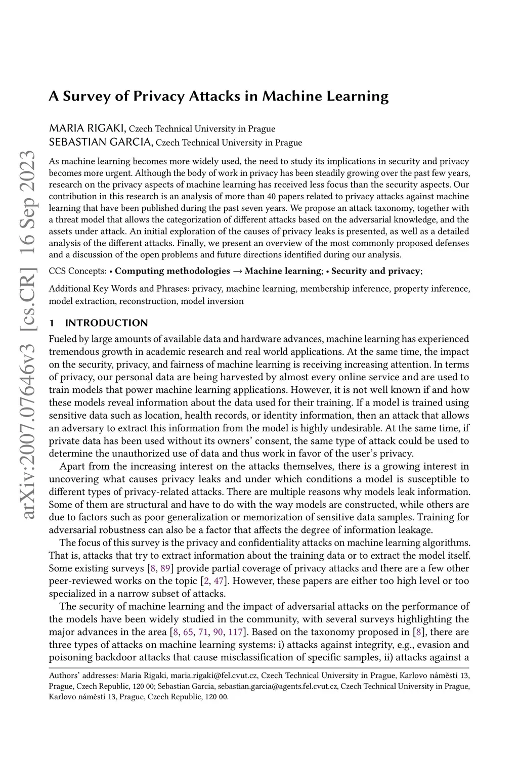 As machine learning becomes more widely used, the need to study its implications in security and privacy becomes more urgent. Although the body of work in privacy has been steadily growing over the past few years, research on the privacy aspects of machine learning has received less focus than the security aspects. Our contribution in this research is an analysis of more than 40 papers related to privacy attacks against machine learning that have been published during the past seven years. We propose an attack taxonomy, together with a threat model that allows the categorization of different attacks based on the adversarial knowledge, and the assets under attack. An initial exploration of the causes of privacy leaks is presented, as well as a detailed analysis of the different attacks. Finally, we present an overview of the most commonly proposed defenses and a discussion of the open problems and future directions identified during our analysis.
