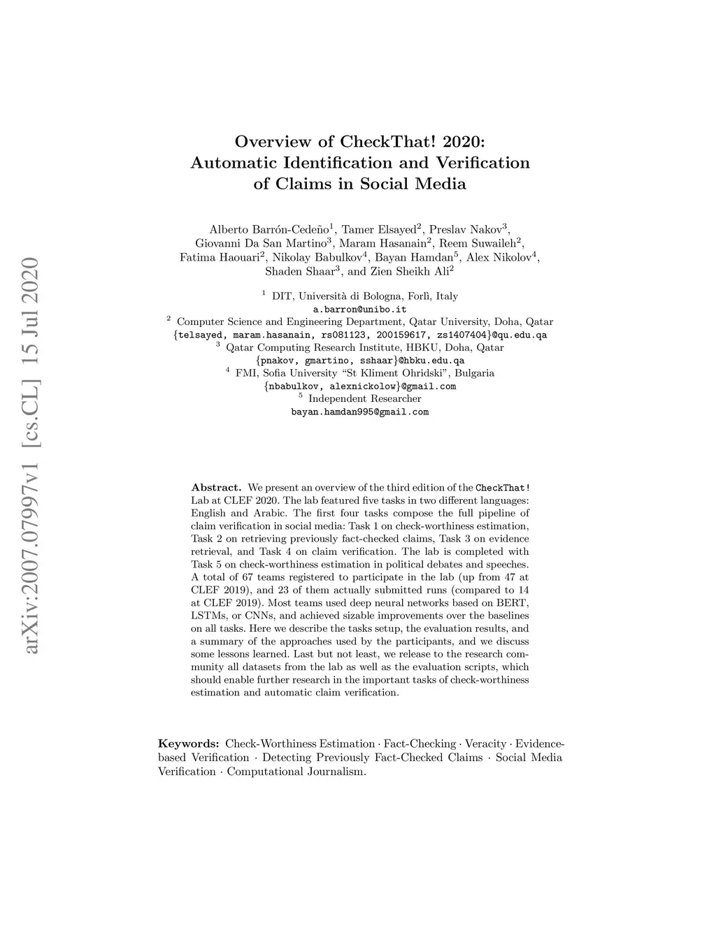 Overview of CheckThat! 2020: Automatic Identification and Verification