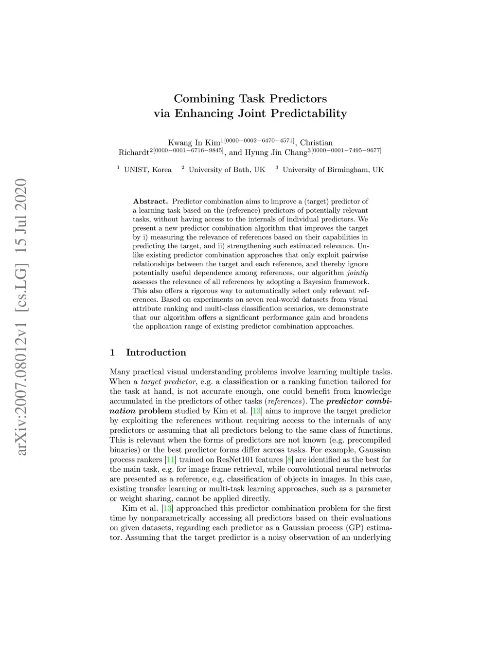 Predictor combination aims to improve a (target) predictor of a learning task based on the (reference) predictors of potentially relevant tasks, without having access to the internals of individual predictors. We present a new predictor combination algorithm that improves the target by i) measuring the relevance of references based on their capabilities in predicting the target, and ii) strengthening such estimated relevance. Unlike existing predictor combination approaches that only exploit pairwise relationships between the target and each reference, and thereby ignore potentially useful dependence among references, our algorithm jointly assesses the relevance of all references by adopting a Bayesian framework. This also offers a rigorous way to automatically select only relevant references. Based on experiments on seven real-world datasets from visual attribute ranking and multi-class classification scenarios, we demonstrate that our algorithm offers a significant performance gain and broadens the application range of existing predictor combination approaches.
