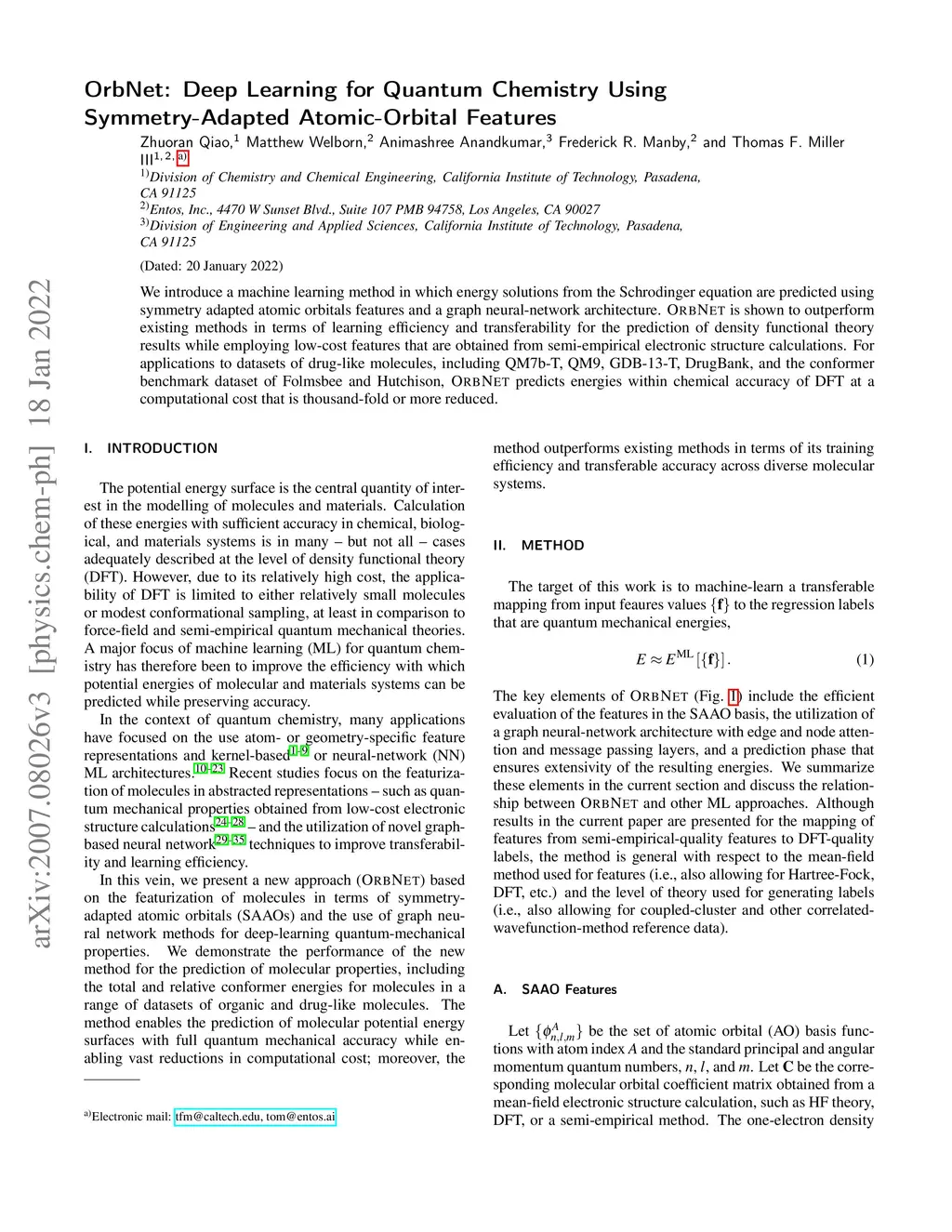 We introduce a machine learning method in which energy solutions from the Schrodinger equation are predicted using symmetry adapted atomic orbitals features and a graph neural-network architecture. \textsc{OrbNet} is shown to outperform existing methods in terms of learning efficiency and transferability for the prediction of density functional theory results while employing low-cost features that are obtained from semi-empirical electronic structure calculations. For applications to datasets of drug-like molecules, including QM7b-T, QM9, GDB-13-T, DrugBank, and the conformer benchmark dataset of Folmsbee and Hutchison, \textsc{OrbNet} predicts energies within chemical accuracy of DFT at a computational cost that is thousand-fold or more reduced.