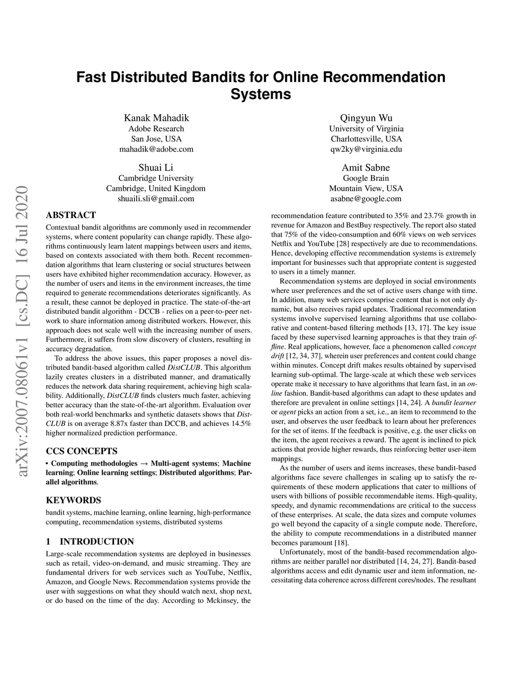 Contextual bandit algorithms are commonly used in recommender systems, where content popularity can change rapidly. These algorithms continuously learn latent mappings between users and items, based on contexts associated with them both. Recent recommendation algorithms that learn clustering or social structures between users have exhibited higher recommendation accuracy. However, as the number of users and items in the environment increases, the time required to generate recommendations deteriorates significantly. As a result, these cannot be deployed in practice. The state-of-the-art distributed bandit algorithm - DCCB - relies on a peer-to-peer net-work to share information among distributed workers. However, this approach does not scale well with the increasing number of users. Furthermore, it suffers from slow discovery of clusters, resulting in accuracy degradation. To address the above issues, this paper proposes a novel distributed bandit-based algorithm called DistCLUB. This algorithm lazily creates clusters in a distributed manner, and dramatically reduces the network data sharing requirement, achieving high scalability. Additionally, DistCLUB finds clusters much faster, achieving better accuracy than the state-of-the-art algorithm. Evaluation over both real-world benchmarks and synthetic datasets shows that DistCLUB is on average 8.87x faster than DCCB, and achieves 14.5% higher normalized prediction performance.