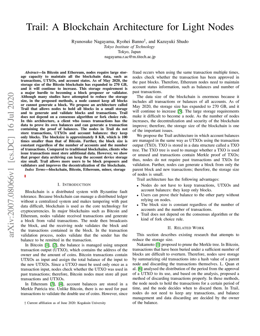 In Bitcoin and Ethereum, nodes require large storage capacity to maintain all the blockchain data, such as transactions, UTXOs, and account states. As of May 2020, the storage size of the Bitcoin blockchain has expanded to 270 GB, and it will continue to increase. This storage requirement is a major hurdle to becoming a block proposer or validator. Although many studies have attempted to reduce the storage size, in the proposed methods, a node cannot keep all blocks or cannot generate a block. We propose an architecture called Trail that allows nodes to hold all blocks in a small storage and to generate and validate blocks and transactions. Trail does not depend on a consensus algorithm or fork choice rule. In this architecture, a client who issues transactions has the data to prove its own balances and can generate a transaction containing the proof of balances. The nodes in Trail do not store transactions, UTXOs and account balances: they keep only blocks. The blocksize is approximately 8 KB, which is 100 times smaller than that of Bitcoin. Further, the block size is constant regardless of the number of accounts and the number of transactions. Compared to traditional blockchains, clients who issue transactions must store additional data. However, we show that proper data archiving can keep the account device storage size small. Trail allows more users to be block proposers and validators and improves the decentralization of the blockchain.