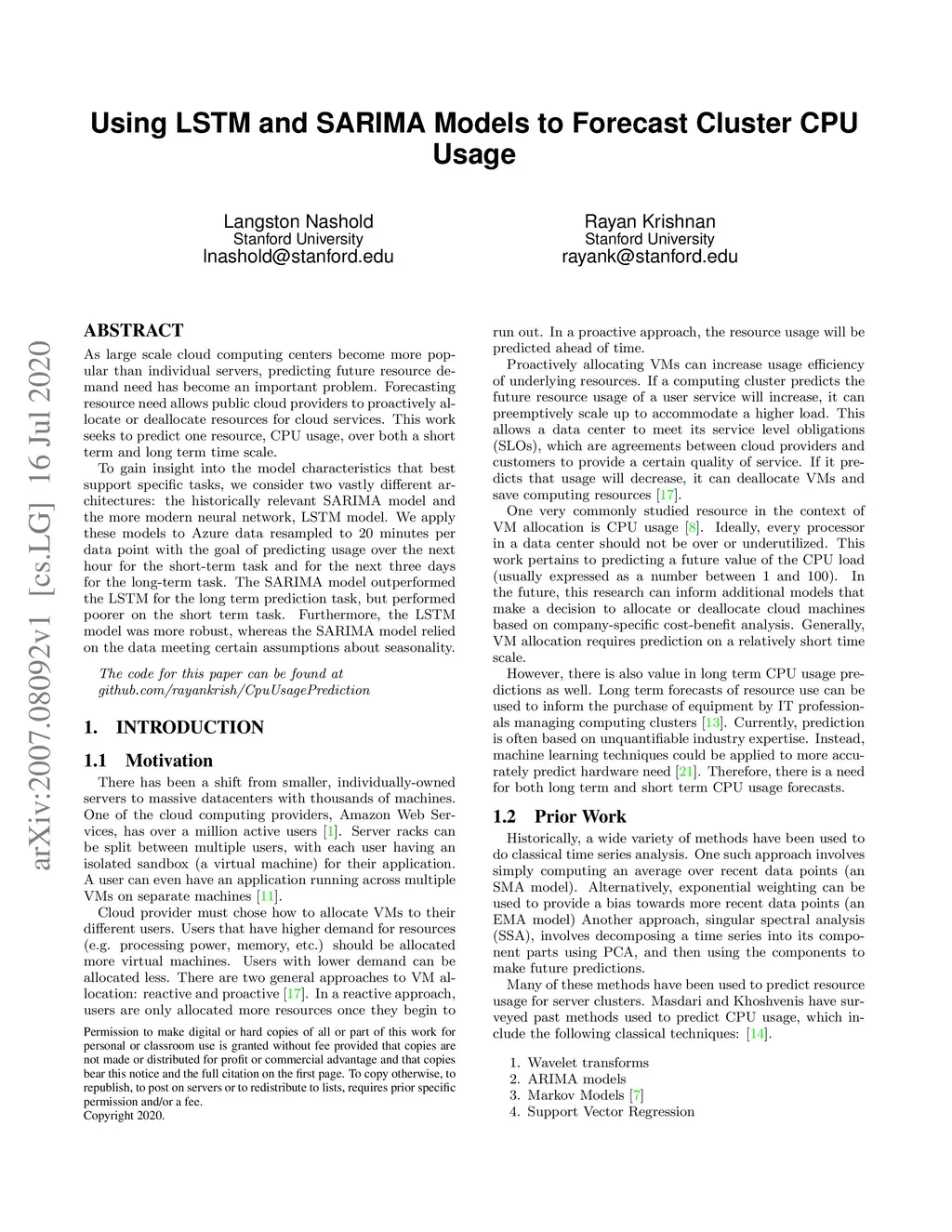 Using LSTM and SARIMA Models to Forecast Cluster CPU Usage