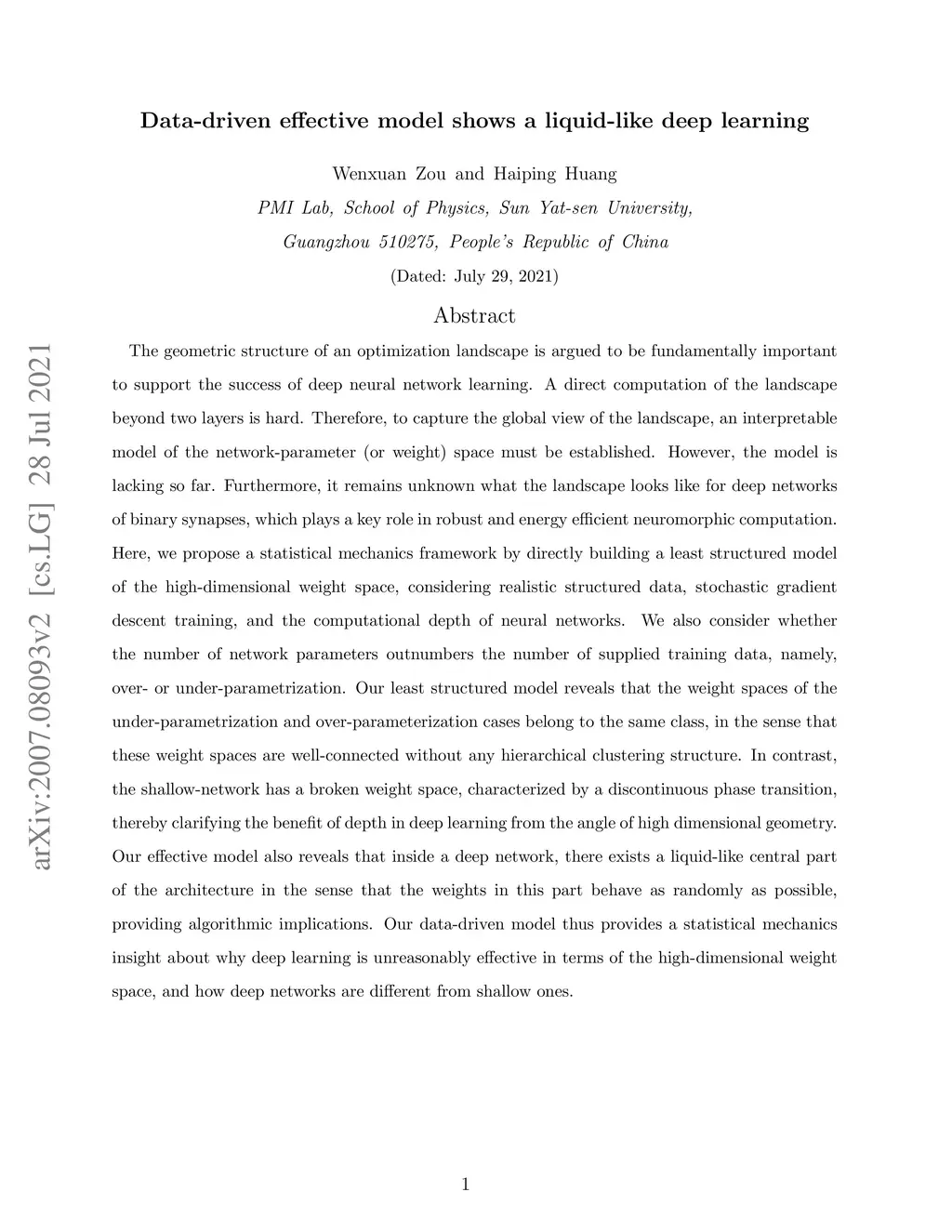 The geometric structure of an optimization landscape is argued to be fundamentally important to support the success of deep neural network learning. A direct computation of the landscape beyond two layers is hard. Therefore, to capture the global view of the landscape, an interpretable model of the network-parameter (or weight) space must be established. However, the model is lacking so far. Furthermore, it remains unknown what the landscape looks like for deep networks of binary synapses, which plays a key role in robust and energy efficient neuromorphic computation. Here, we propose a statistical mechanics framework by directly building a least structured model of the high-dimensional weight space, considering realistic structured data, stochastic gradient descent training, and the computational depth of neural networks. We also consider whether the number of network parameters outnumbers the number of supplied training data, namely, over- or under-parametrization. Our least structured model reveals that the weight spaces of the under-parametrization and over-parameterization cases belong to the same class, in the sense that these weight spaces are well-connected without any hierarchical clustering structure. In contrast, the shallow-network has a broken weight space, characterized by a discontinuous phase transition, thereby clarifying the benefit of depth in deep learning from the angle of high dimensional geometry. Our effective model also reveals that inside a deep network, there exists a liquid-like central part of the architecture in the sense that the weights in this part behave as randomly as possible, providing algorithmic implications. Our data-driven model thus provides a statistical mechanics insight about why deep learning is unreasonably effective in terms of the high-dimensional weight space, and how deep networks are different from shallow ones.
