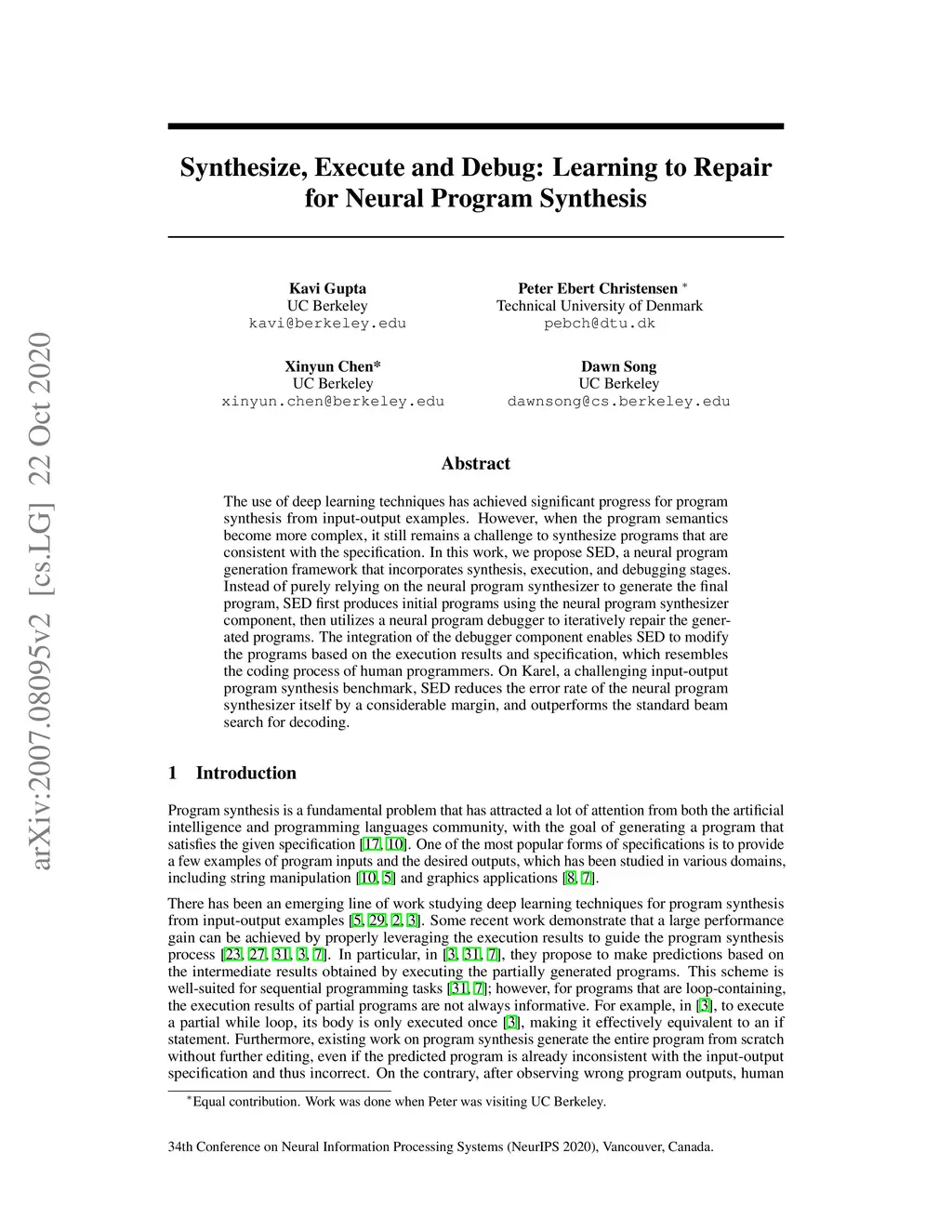 The use of deep learning techniques has achieved significant progress for program synthesis from input-output examples. However, when the program semantics become more complex, it still remains a challenge to synthesize programs consistent with the specification. In this work, we propose SED, a neural program generation framework that incorporates synthesis, execution, and debugging stages. Instead of purely relying on the neural program synthesizer to generate the final program, SED first produces initial programs using the neural program synthesizer component, then utilizes a neural program debugger to iteratively repair the generated programs. The integration of the debugger component enables SED to modify the programs based on the execution results and specification, which resembles the coding process of human programmers. On Karel, a challenging input-output program synthesis benchmark, SED reduces the error rate of the neural program synthesizer itself by at least 7.5%, and outperforms the standard beam search for decoding.