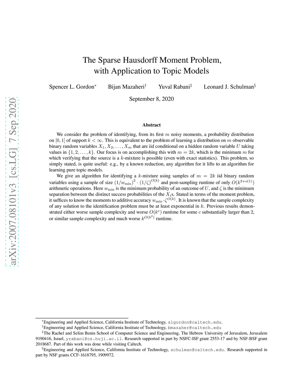 The Sparse Hausdorff Moment Problem, with Application to Topic Models