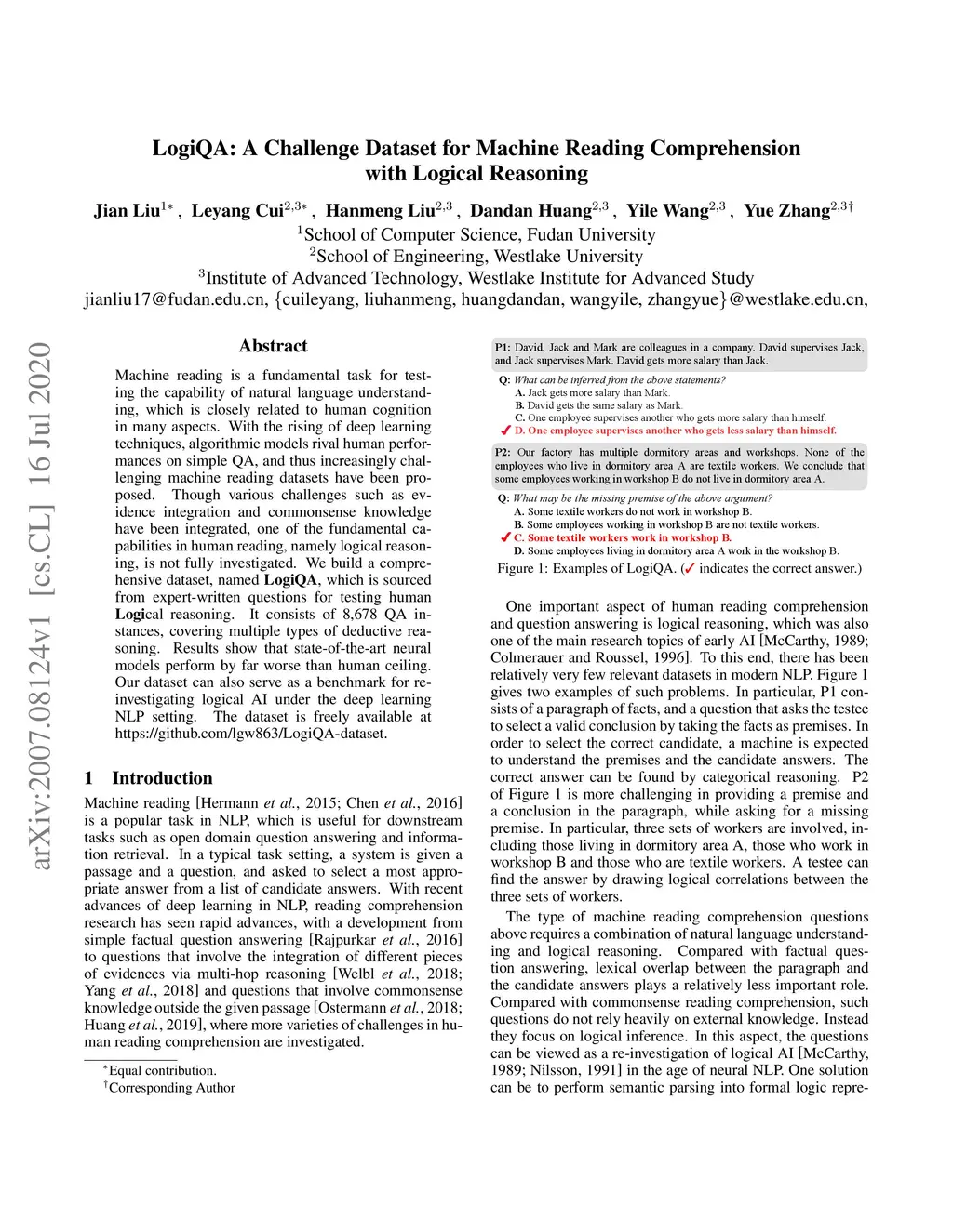 LogiQA: A Challenge Dataset for Machine Reading Comprehension with