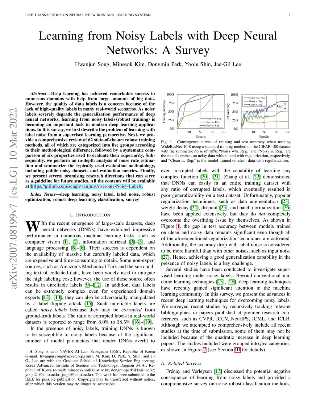 Deep learning has achieved remarkable success in numerous domains with help from large amounts of big data. However, the quality of data labels is a concern because of the lack of high-quality labels in many real-world scenarios. As noisy labels severely degrade the generalization performance of deep neural networks, learning from noisy labels (robust training) is becoming an important task in modern deep learning applications. In this survey, we first describe the problem of learning with label noise from a supervised learning perspective. Next, we provide a comprehensive review of 62 state-of-the-art robust training methods, all of which are categorized into five groups according to their methodological difference, followed by a systematic comparison of six properties used to evaluate their superiority. Subsequently, we perform an in-depth analysis of noise rate estimation and summarize the typically used evaluation methodology, including public noisy datasets and evaluation metrics. Finally, we present several promising research directions that can serve as a guideline for future studies. All the contents will be available at https://github.com/songhwanjun/Awesome-Noisy-Labels.