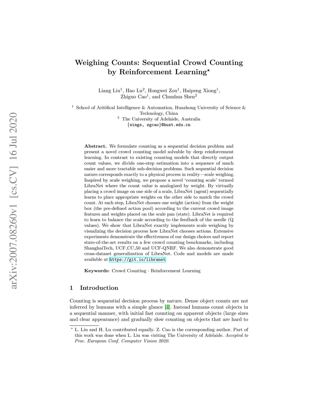 We formulate counting as a sequential decision problem and present a novel crowd counting model solvable by deep reinforcement learning. In contrast to existing counting models that directly output count values, we divide one-step estimation into a sequence of much easier and more tractable sub-decision problems. Such sequential decision nature corresponds exactly to a physical process in reality scale weighing. Inspired by scale weighing, we propose a novel 'counting scale' termed LibraNet where the count value is analogized by weight. By virtually placing a crowd image on one side of a scale, LibraNet (agent) sequentially learns to place appropriate weights on the other side to match the crowd count. At each step, LibraNet chooses one weight (action) from the weight box (the pre-defined action pool) according to the current crowd image features and weights placed on the scale pan (state). LibraNet is required to learn to balance the scale according to the feedback of the needle (Q values). We show that LibraNet exactly implements scale weighing by visualizing the decision process how LibraNet chooses actions. Extensive experiments demonstrate the effectiveness of our design choices and report state-of-the-art results on a few crowd counting benchmarks. We also demonstrate good cross-dataset generalization of LibraNet. Code and models are made available at: https://git.io/libranet