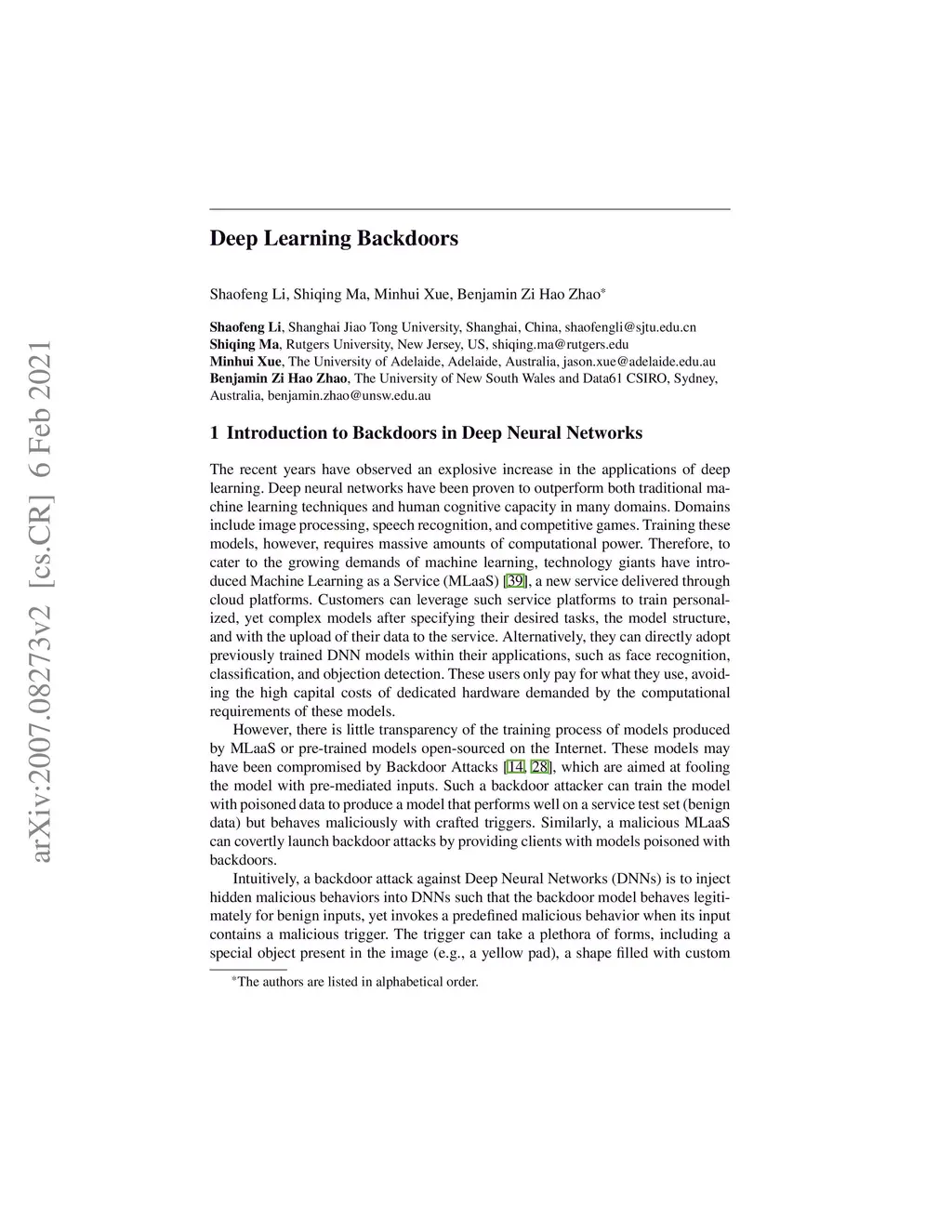 Intuitively, a backdoor attack against Deep Neural Networks (DNNs) is to inject hidden malicious behaviors into DNNs such that the backdoor model behaves legitimately for benign inputs, yet invokes a predefined malicious behavior when its input contains a malicious trigger. The trigger can take a plethora of forms, including a special object present in the image (e.g., a yellow pad), a shape filled with custom textures (e.g., logos with particular colors) or even image-wide stylizations with special filters (e.g., images altered by Nashville or Gotham filters). These filters can be applied to the original image by replacing or perturbing a set of image pixels.