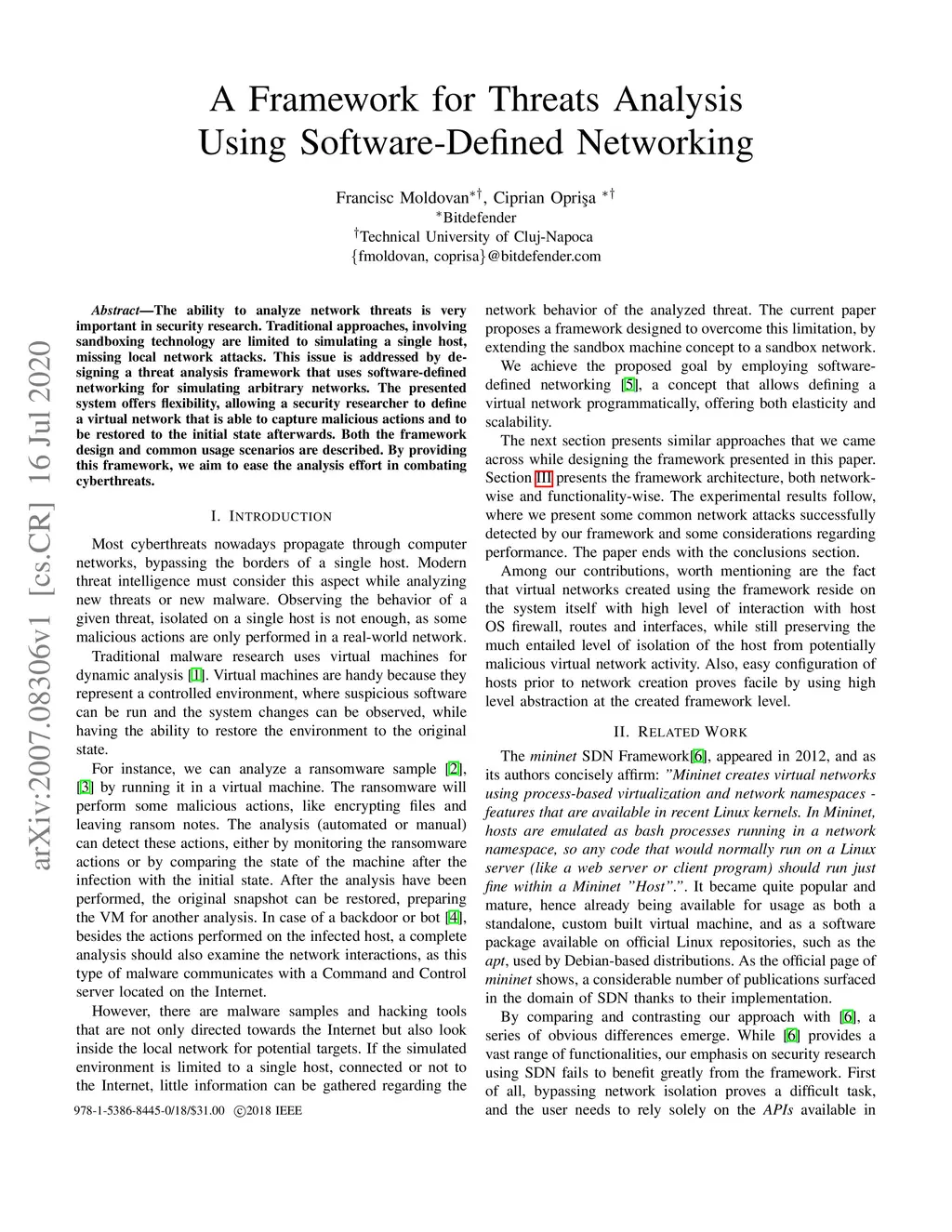 The ability to analyze network threats is very important in security research. Traditional approaches, involving sandboxing technology are limited to simulating a single host, missing local network attacks. This issue is addressed by designing a threat analysis framework that uses software-defined networking for simulating arbitrary networks. The presented system offers flexibility, allowing a security researcher to define a virtual network that is able to capture malicious actions and to be restored to the initial state afterwards. Both the framework design and common usage scenarios are described. By providing this framework, we aim to ease the analysis effort in combating cyberthreats.