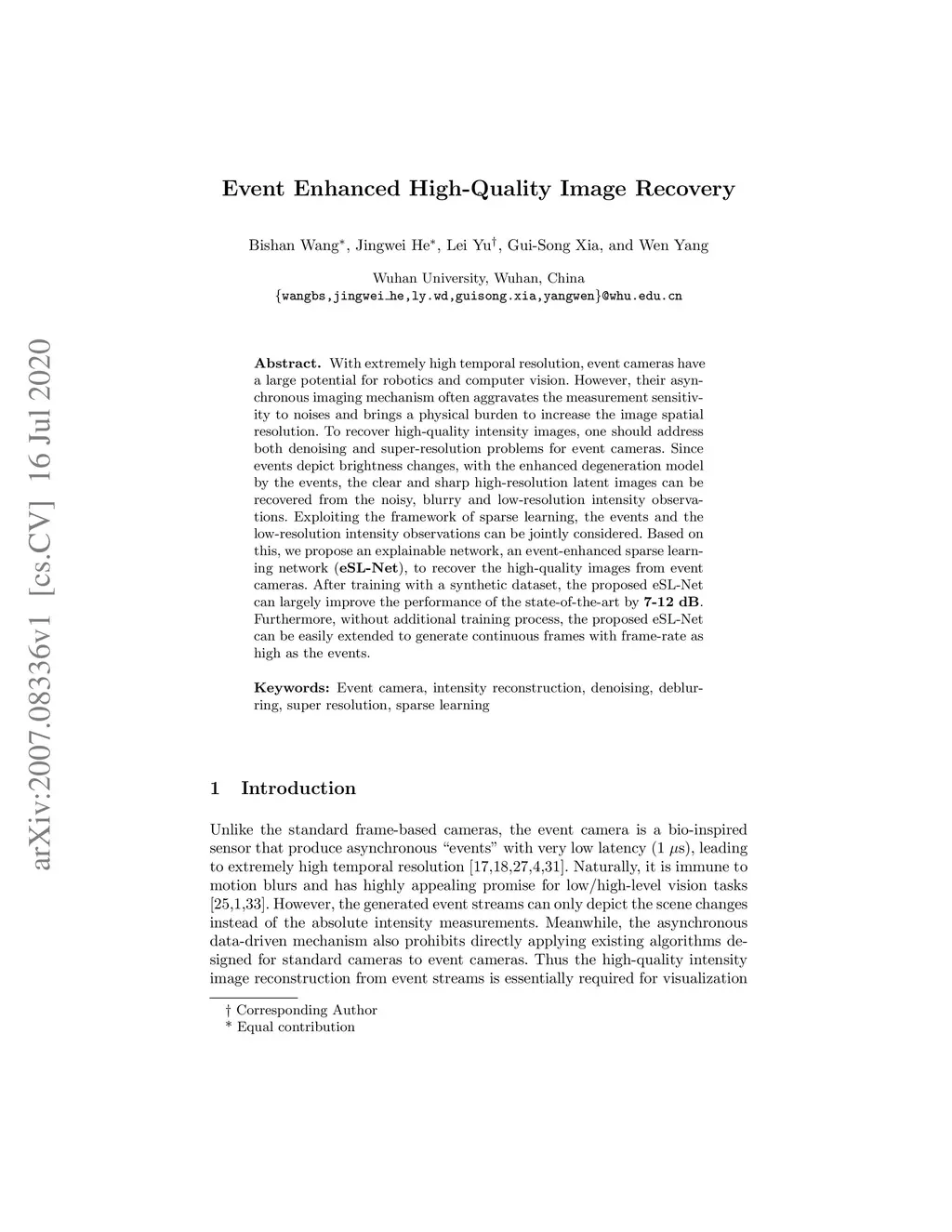 With extremely high temporal resolution, event cameras have a large potential for robotics and computer vision. However, their asynchronous imaging mechanism often aggravates the measurement sensitivity to noises and brings a physical burden to increase the image spatial resolution. To recover high-quality intensity images, one should address both denoising and super-resolution problems for event cameras. Since events depict brightness changes, with the enhanced degeneration model by the events, the clear and sharp high-resolution latent images can be recovered from the noisy, blurry and low-resolution intensity observations. Exploiting the framework of sparse learning, the events and the low-resolution intensity observations can be jointly considered. Based on this, we propose an explainable network, an event-enhanced sparse learning network (eSL-Net), to recover the high-quality images from event cameras. After training with a synthetic dataset, the proposed eSL-Net can largely improve the performance of the state-of-the-art by 7-12 dB. Furthermore, without additional training process, the proposed eSL-Net can be easily extended to generate continuous frames with frame-rate as high as the events.