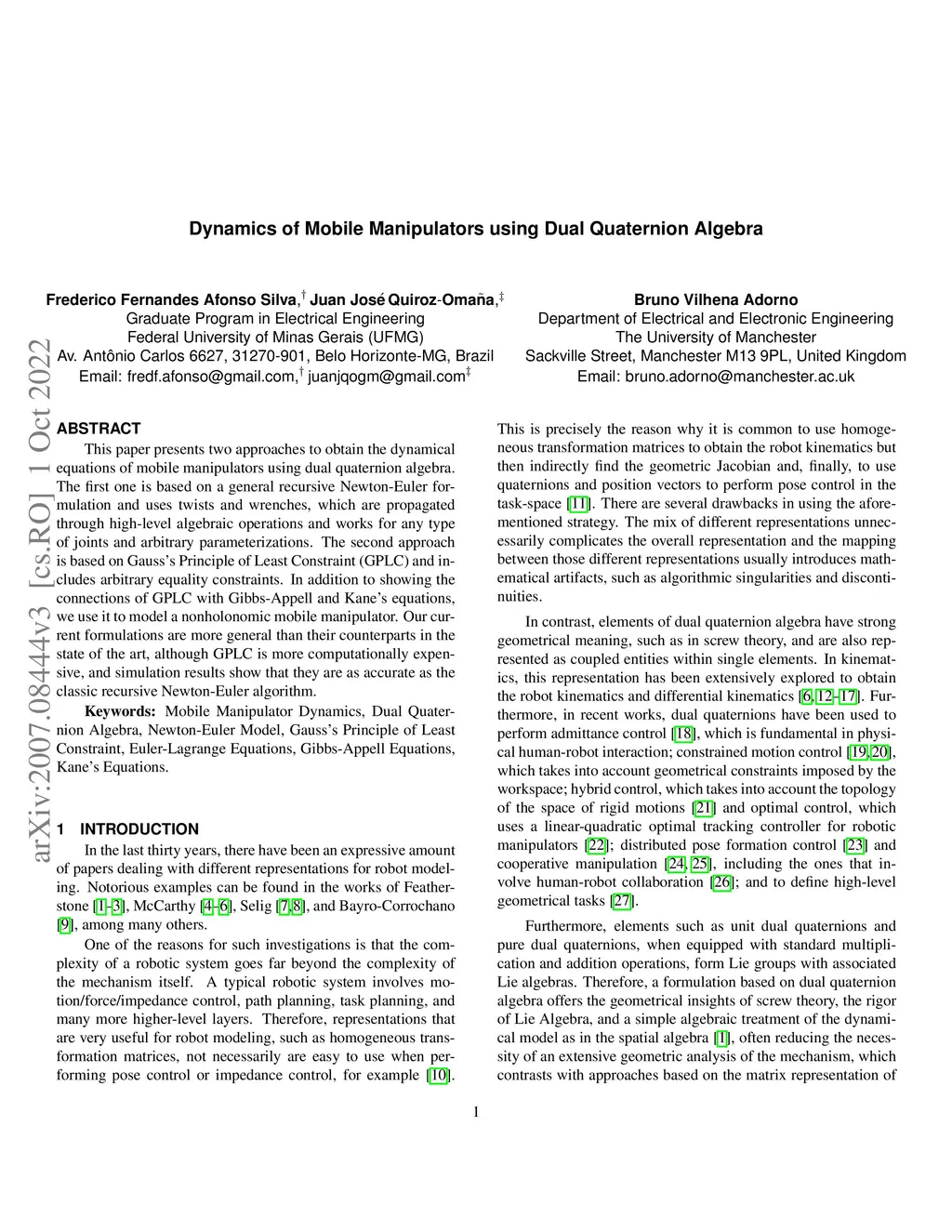 This paper presents two approaches to obtain the dynamical equations of mobile manipulators using dual quaternion algebra. The first one is based on a general recursive Newton-Euler formulation and uses twists and wrenches, which are propagated through high-level algebraic operations and works for any type of joints and arbitrary parameterizations. The second approach is based on Gauss's Principle of Least Constraint (GPLC) and includes arbitrary equality constraints. In addition to showing the connections of GPLC with Gibbs-Appell and Kane's equations, we use it to model a nonholonomic mobile manipulator. Our current formulations are more general than their counterparts in the state of the art, although GPLC is more computationally expensive, and simulation results show that they are as accurate as the classic recursive Newton-Euler algorithm.